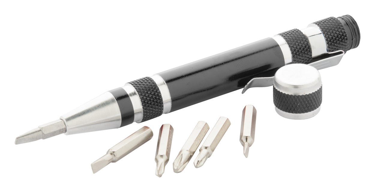 Șurubelniță din aluminiu cu 6 capete interschimbabile.