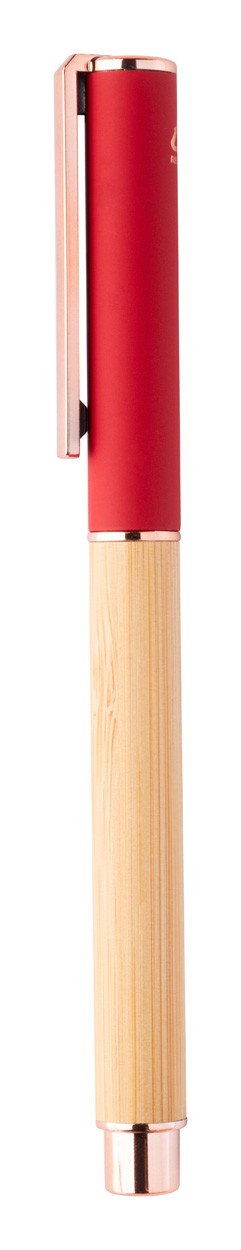 Pix roller din bambus și aluminiu reciclat, cu capac cauciucat și detalii auriu roz. Cu acoperire specială pentru gravarea laser în oglindă în culoarea aur roz. Cu mină albastră.