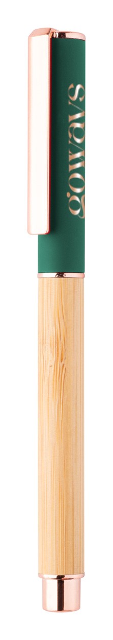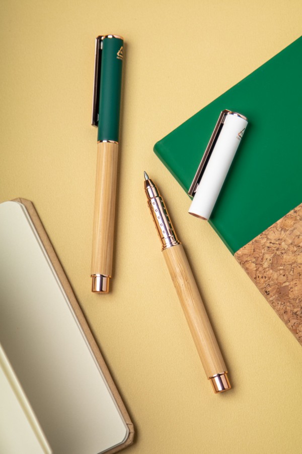 Pix roller din bambus și aluminiu reciclat, cu capac cauciucat și detalii auriu roz. Cu acoperire specială pentru gravarea laser în oglindă în culoarea aur roz. Cu mină albastră.
