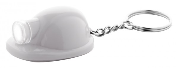 Breloc în formă de cască de siguranță, din plastic, cu lumină LED. Cu baterie tip ceas.