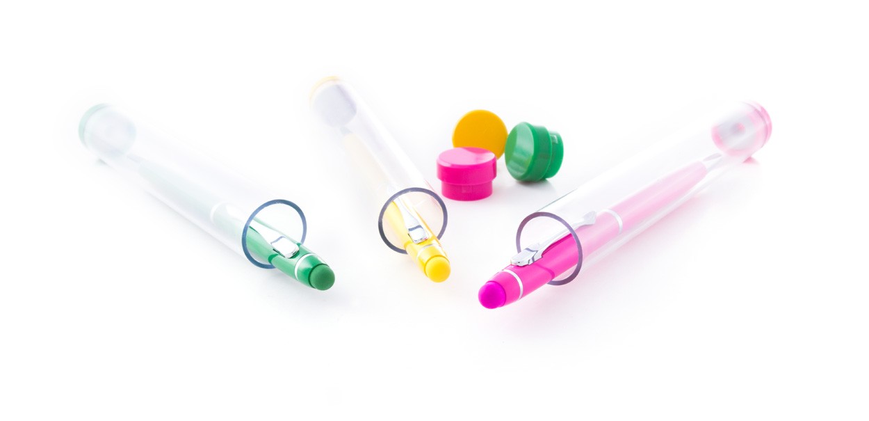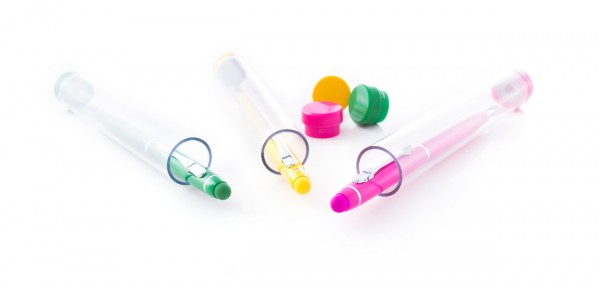 Pix touch screen din aluminiu, cu suport, în suport transparent din plastic. Mină albastră.