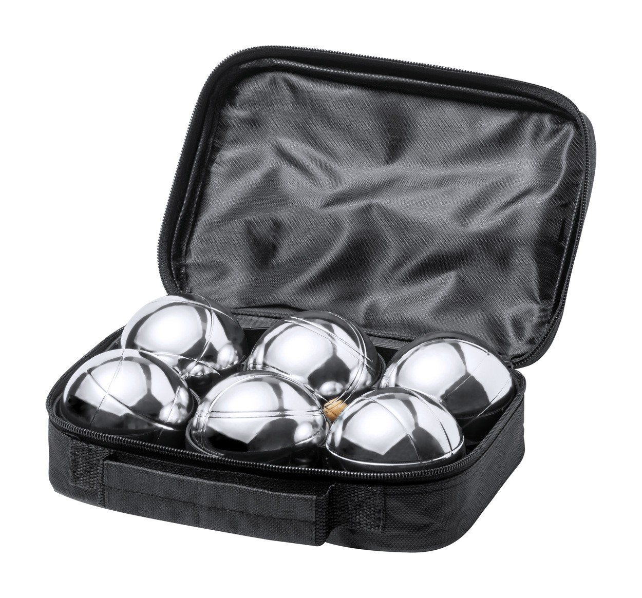 Set joc de petanca cu 6 bile metalice. În husă de transport din poliester RPET cu fermoar.