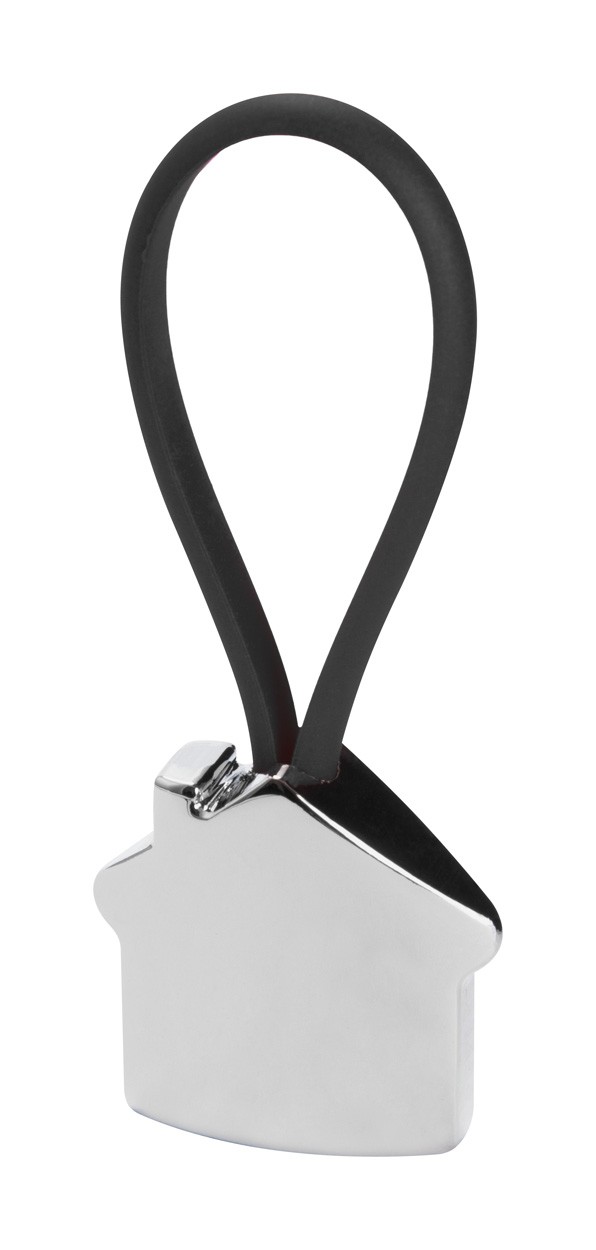 Breloc din aluminiu în formă de casă, cu cauciuc colorat.