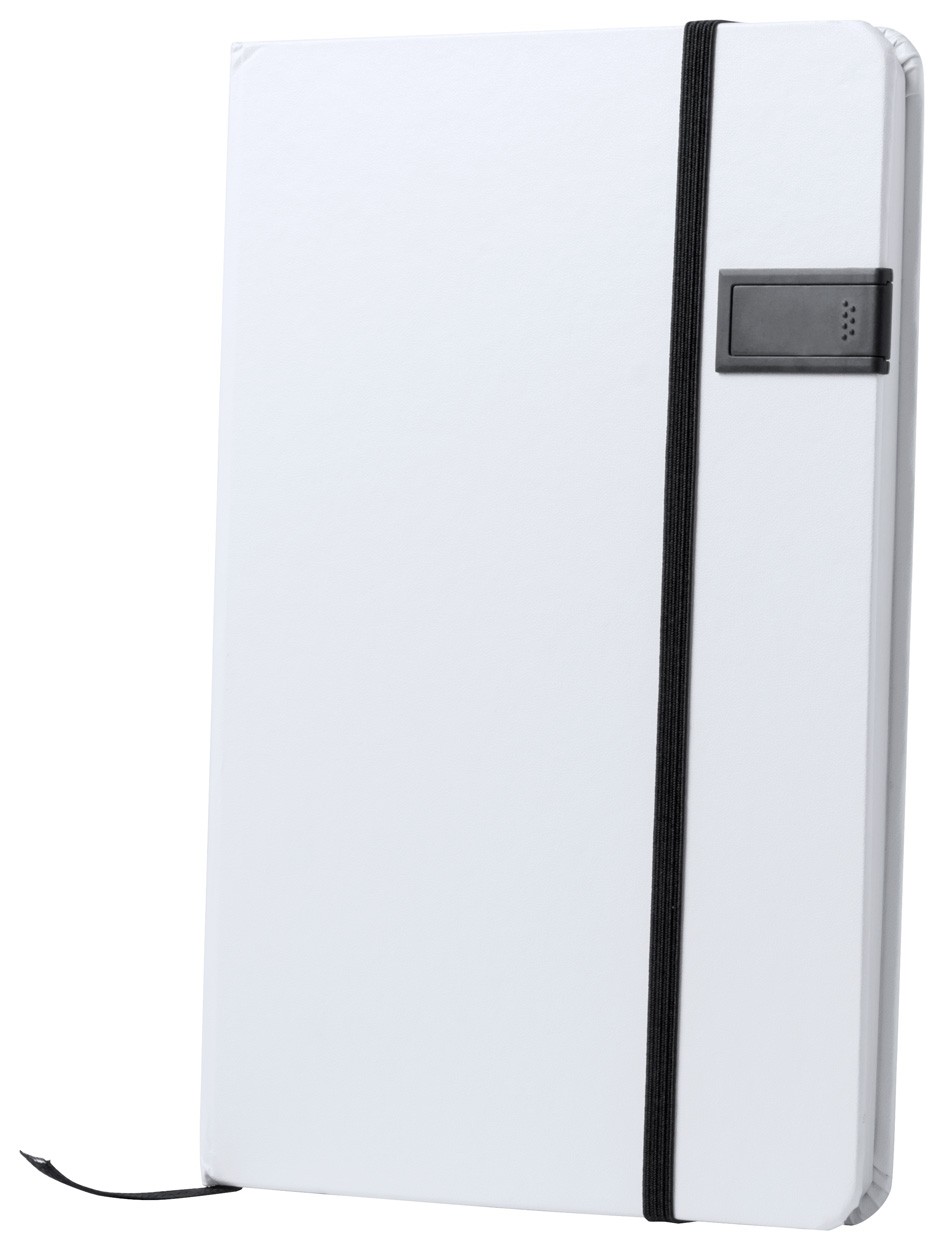 Carnețel cu copertă din carton, 100 file dictando, curea colorată din cauciuc. Memorie USB de 16 GB încorporată.