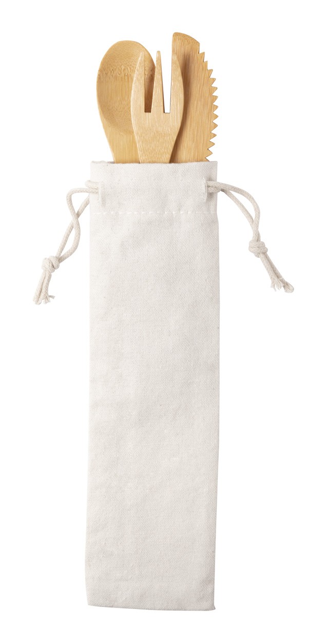 Set 3 buc. tacâmuri din bambus în săculeț de bumbac.