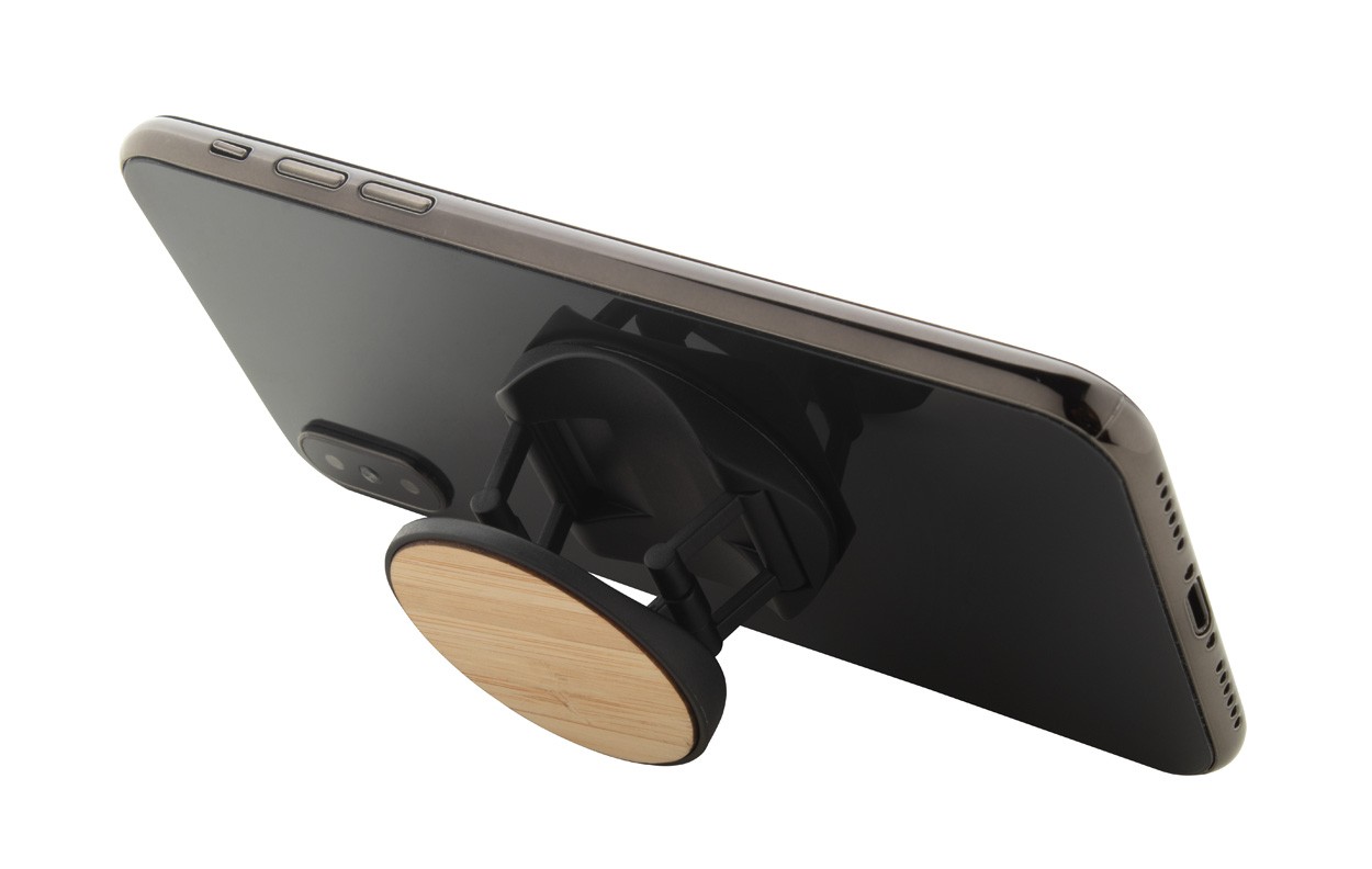 Suport telefon mobil, din plastic, acoperit cu bambus, rotund, din plastic, cu bază autoadezivă.