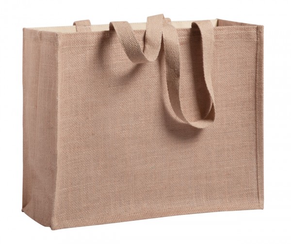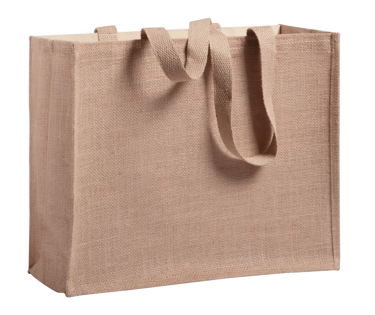 Sacoșă de cumpărături, in combinație de iută laminată și bumbac laminat, cu mânere lungi.