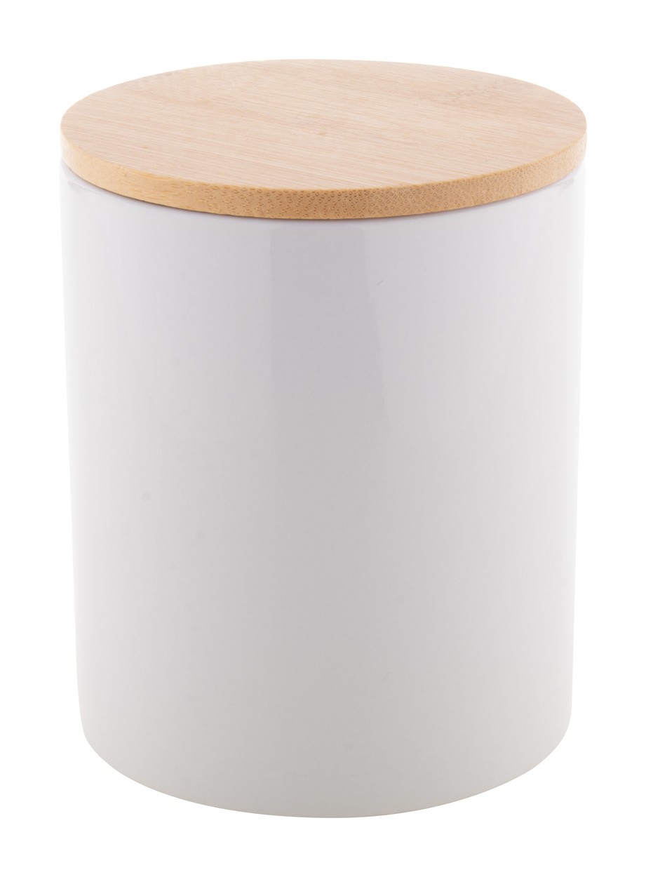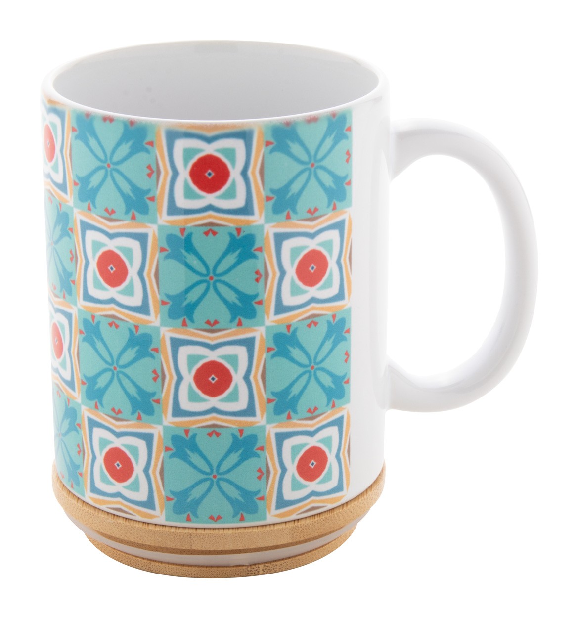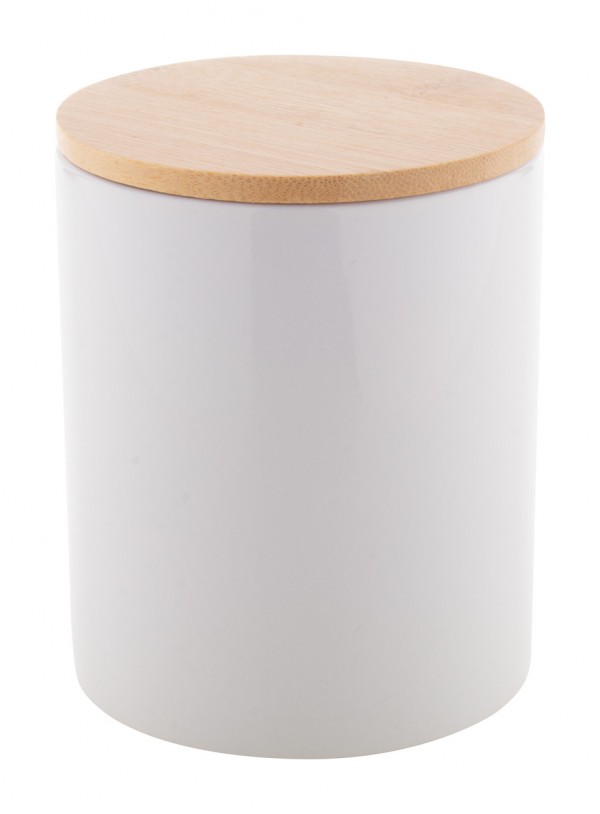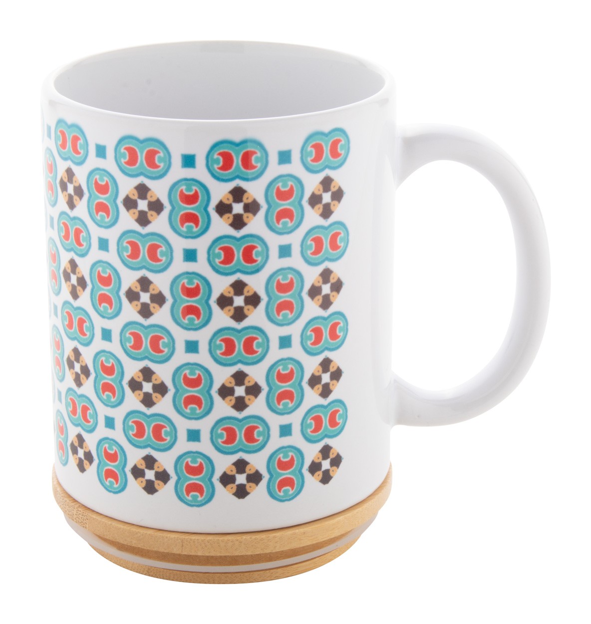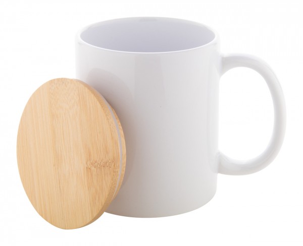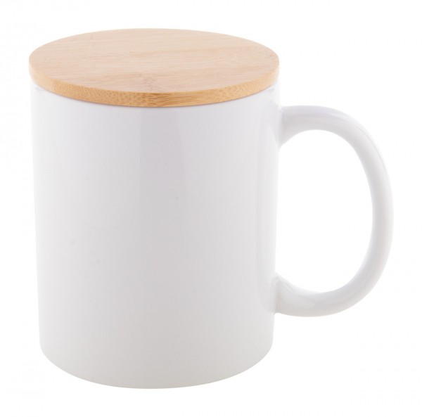 Cană ceramică albă, cu capac din bambus, pentru imprimare prin sublimare, lavabilă în mașina de spălat vase, 300 ml. În cutie de hârtie kraft.