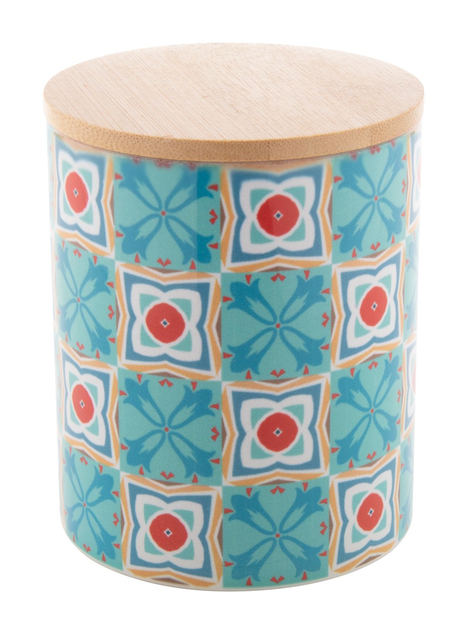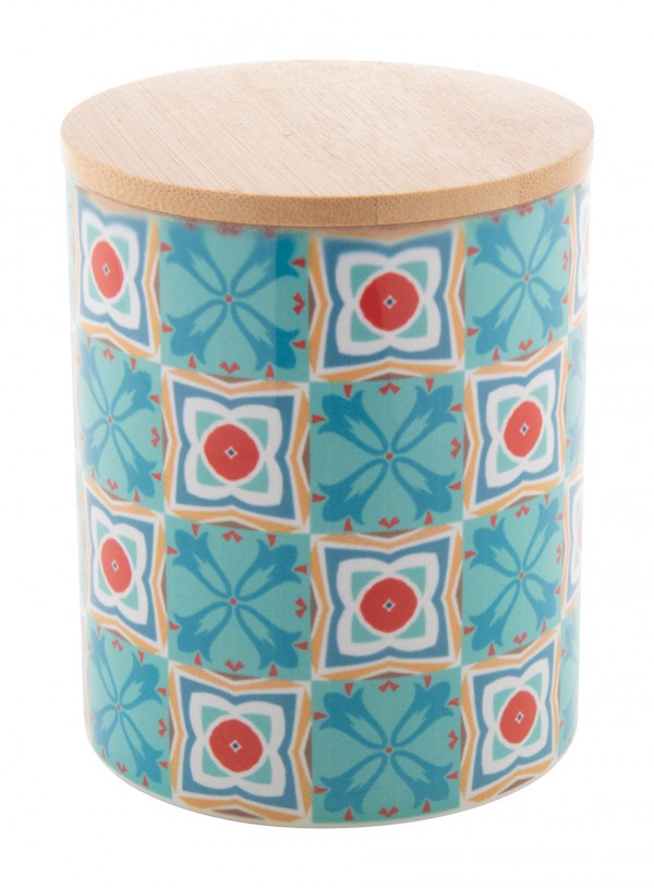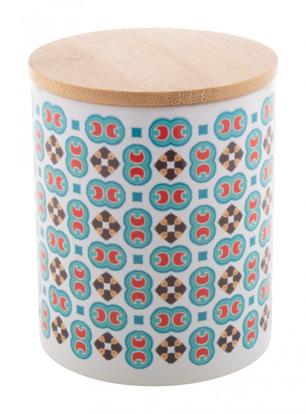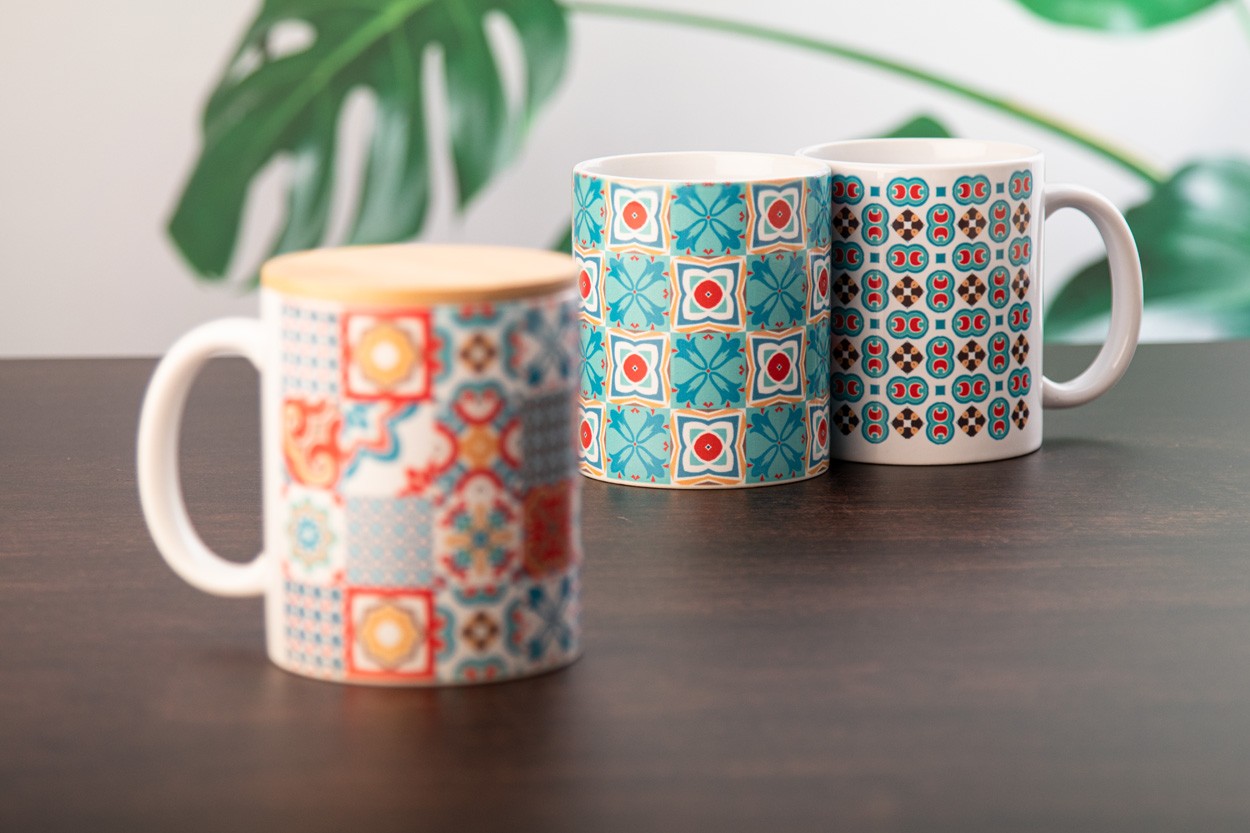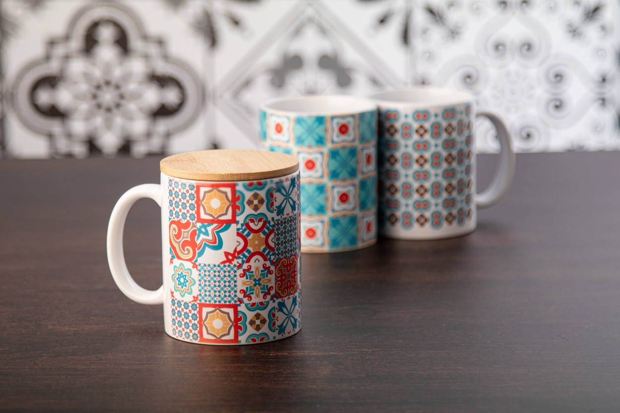 Cană ceramică albă, cu capac din bambus, pentru imprimare prin sublimare, lavabilă în mașina de spălat vase, 300 ml. În cutie de hârtie kraft.