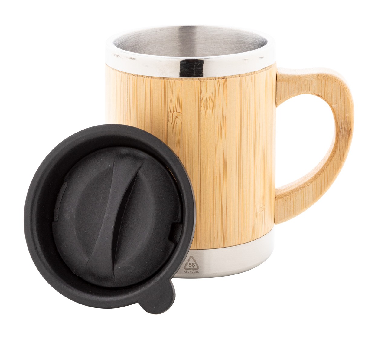 Cană termoizolată, din oțel inoxidabil reciclat, acoperită cu bambus, cu perete dublu, cu mâner din bambus și capac de băut din PP, 300 ml.