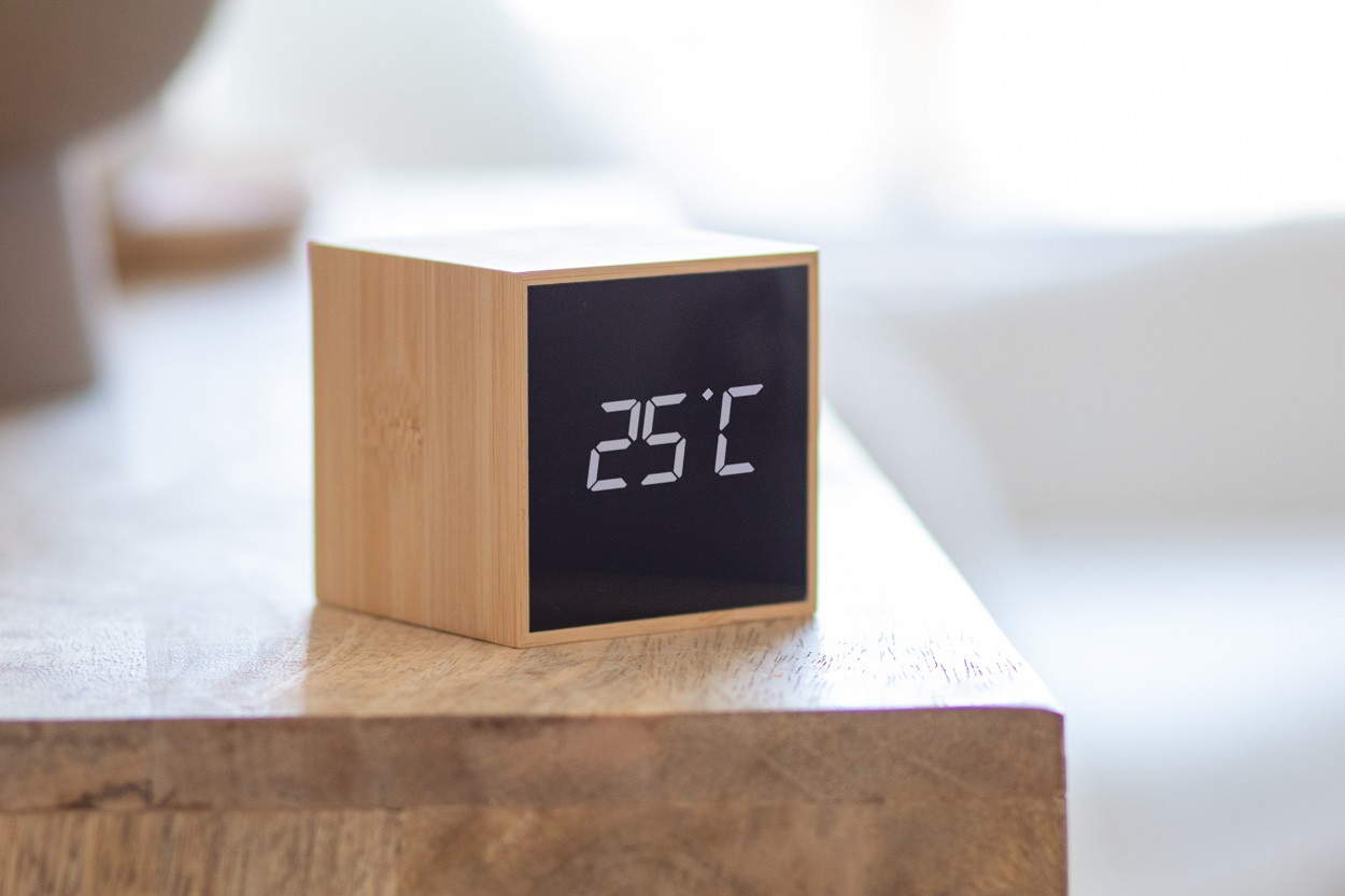 Ceas digital, cu carcasa din bambus, cu alarmă și termometru, afișaj alb cu LED-uri. Poate fi alimentat prin cablul de încărcare USB inclus sau cu 3 baterii AAA (fără baterie).