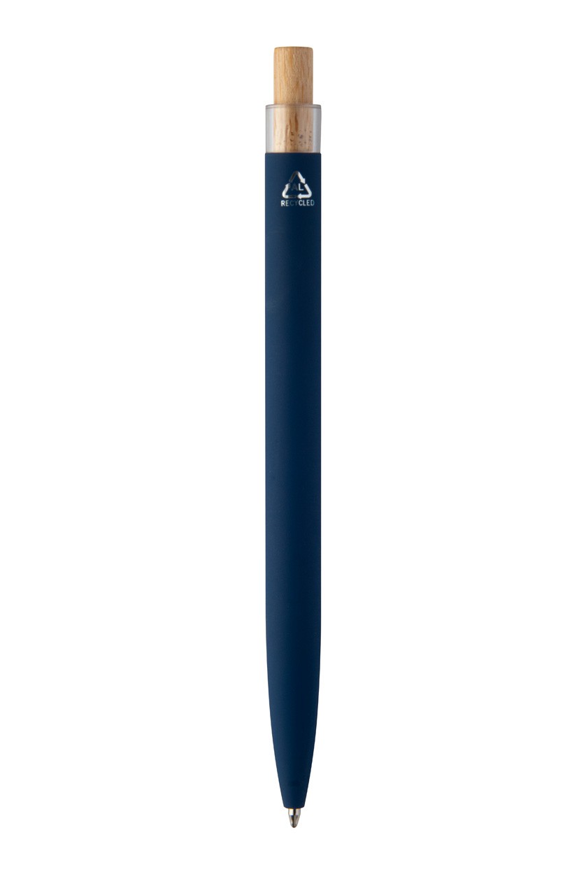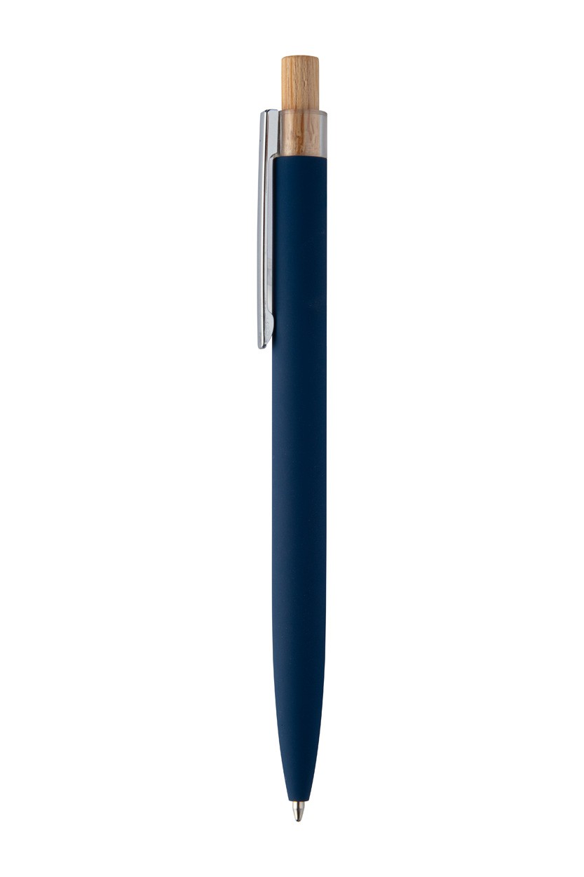 Pix din aluminiu reciclat, cu finisaj cauciucat, buton din bambus și clemă cromată. Cu acoperire specială pentru gravarea laser în oglindă. Cu mină albastră.