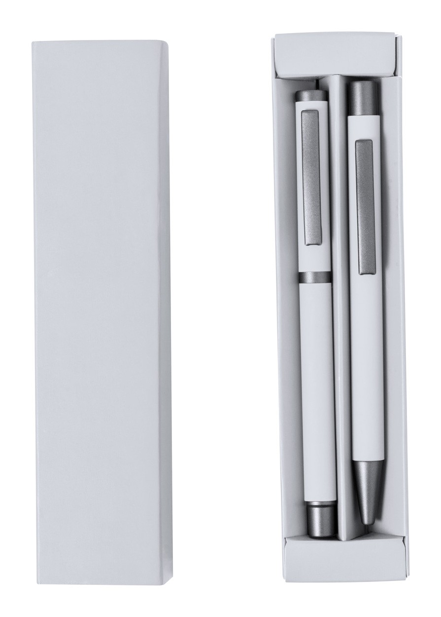 Aluminium ballpoint pen and capped roller pen with metal clip, rubberised finish and blue refill. In gift box.