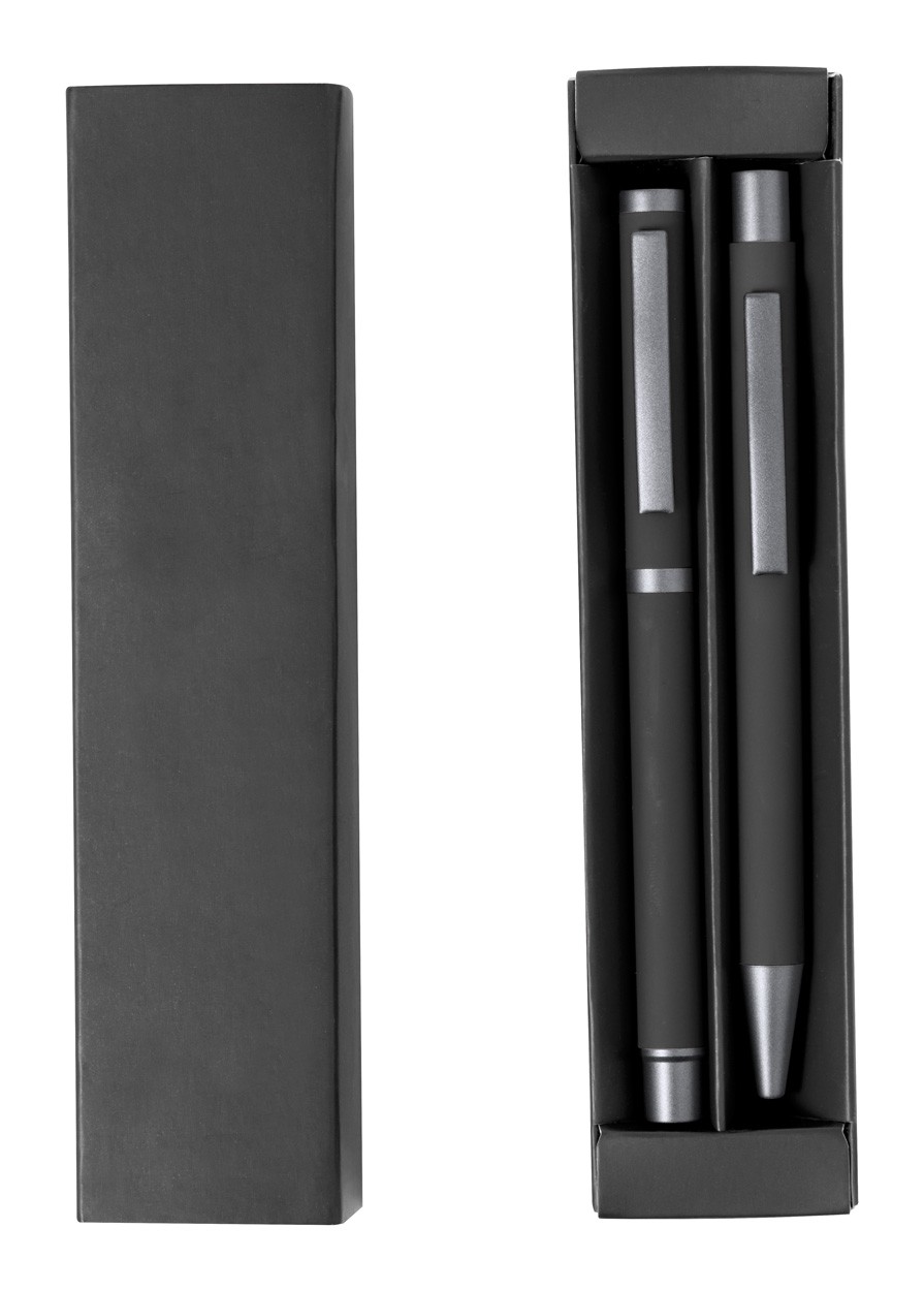 Aluminium ballpoint pen and capped roller pen with metal clip, rubberised finish and blue refill. In gift box.