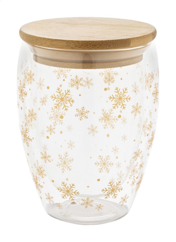 Pahar termic, din sticlă borosilicată, cu perete dublu, cu design de Crăciun cu fulgi de nea și capac din bambus, 310 ml. În cutie de hârtie kraft.