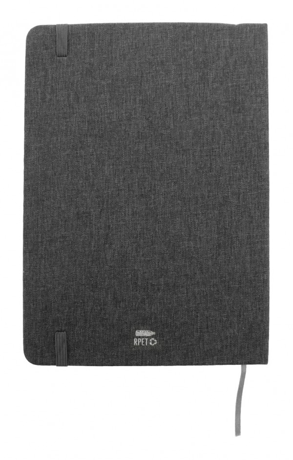 Caiet acoperit cu poliester RPET, cu inserție din bambus și funcție de suport mobil. Cu 80 de foi dictando, din hârtie reciclată, semn de carte și curea de cauciuc. Dimensiune A5.