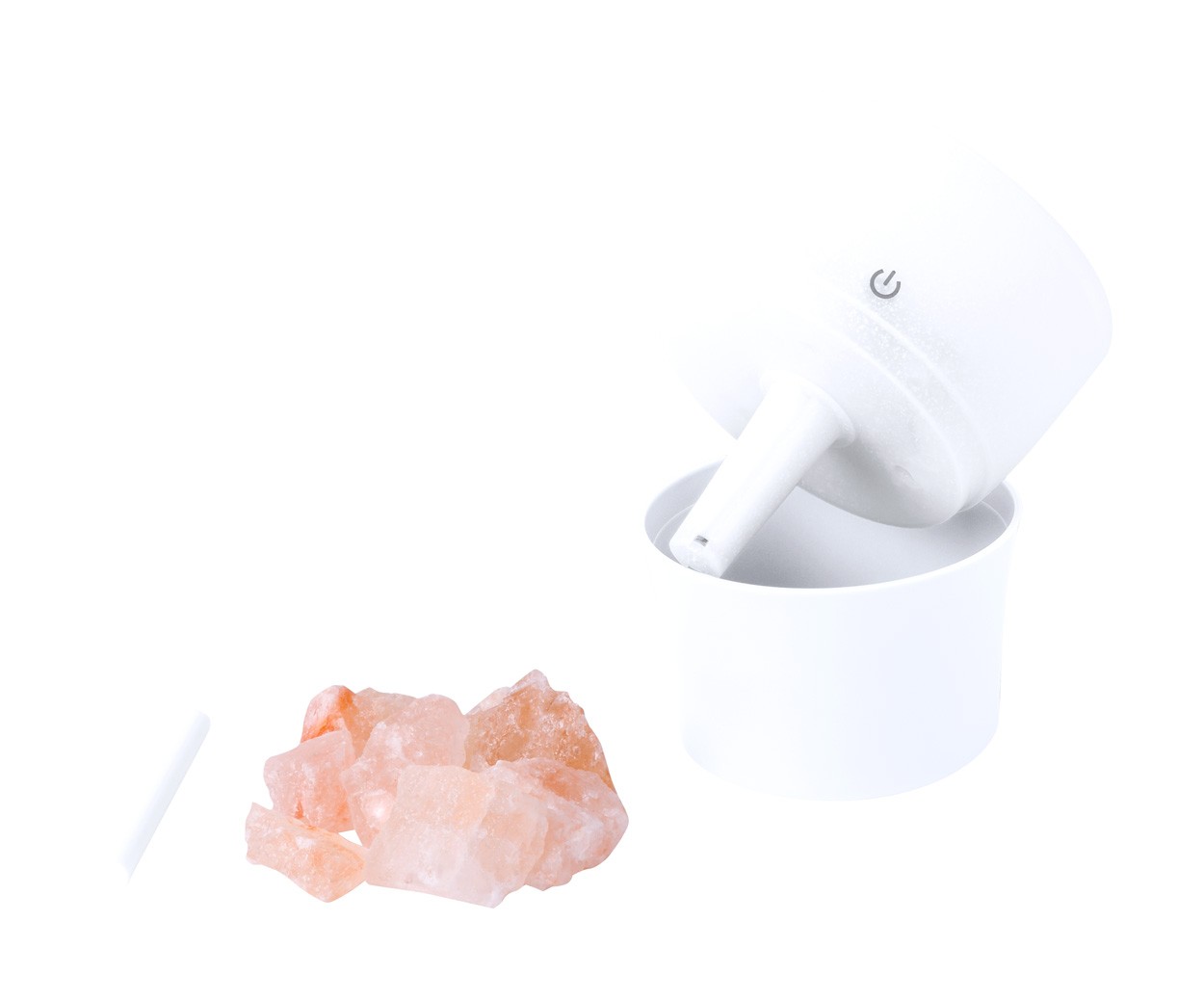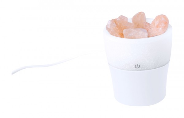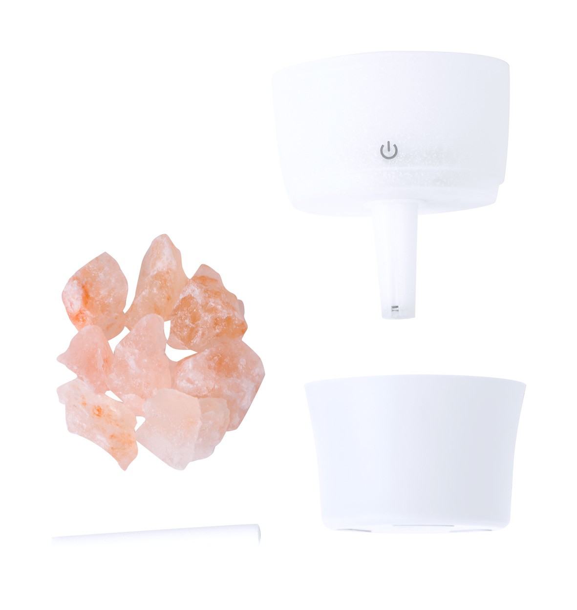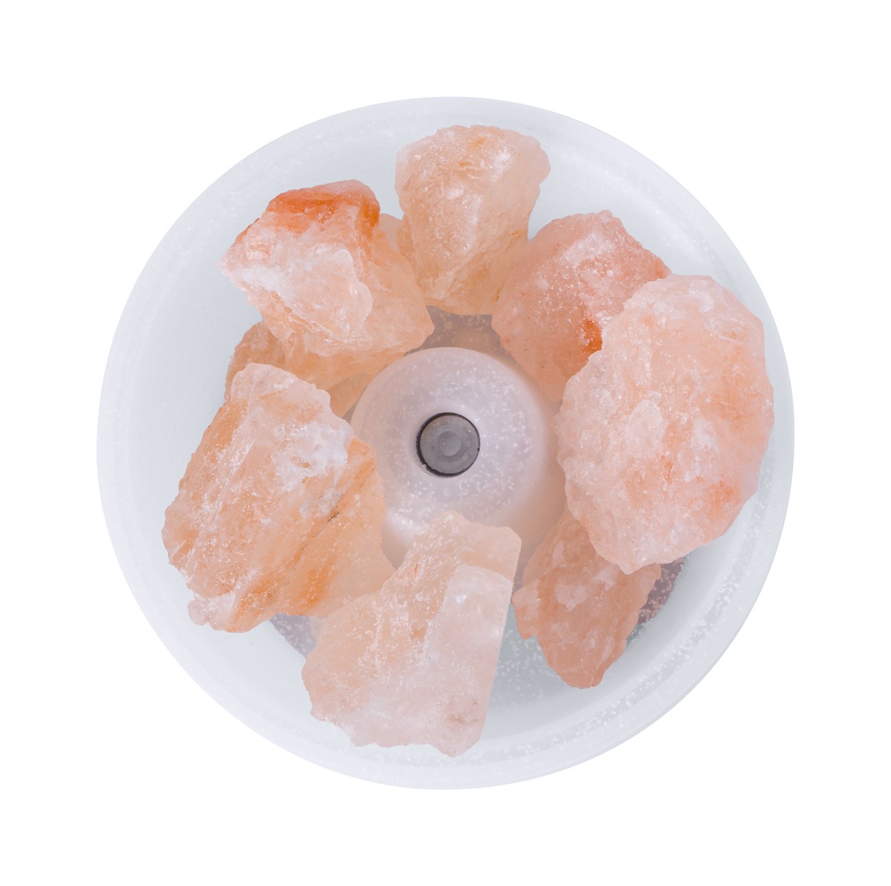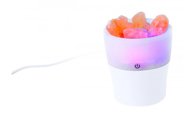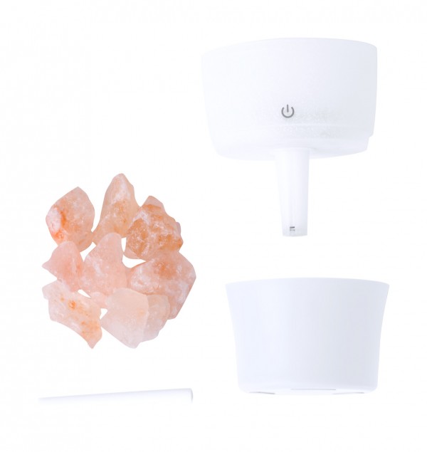 Aroma diffuser with multicolour LED light, 150 ml tank capacity and pink himalayan salt stones. Including USB charger cable.