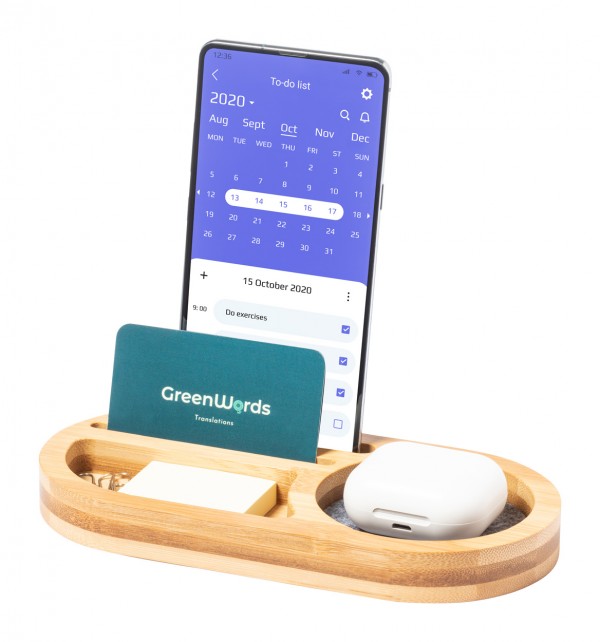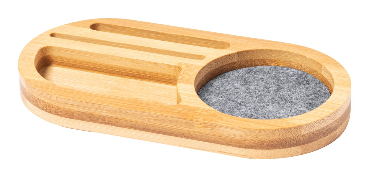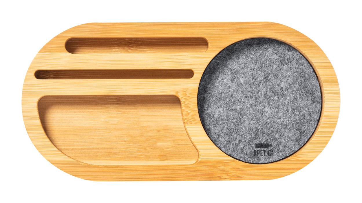 Organizator de birou din pâslă RPET și bambus, cu funcție de suport pentru telefon mobil.