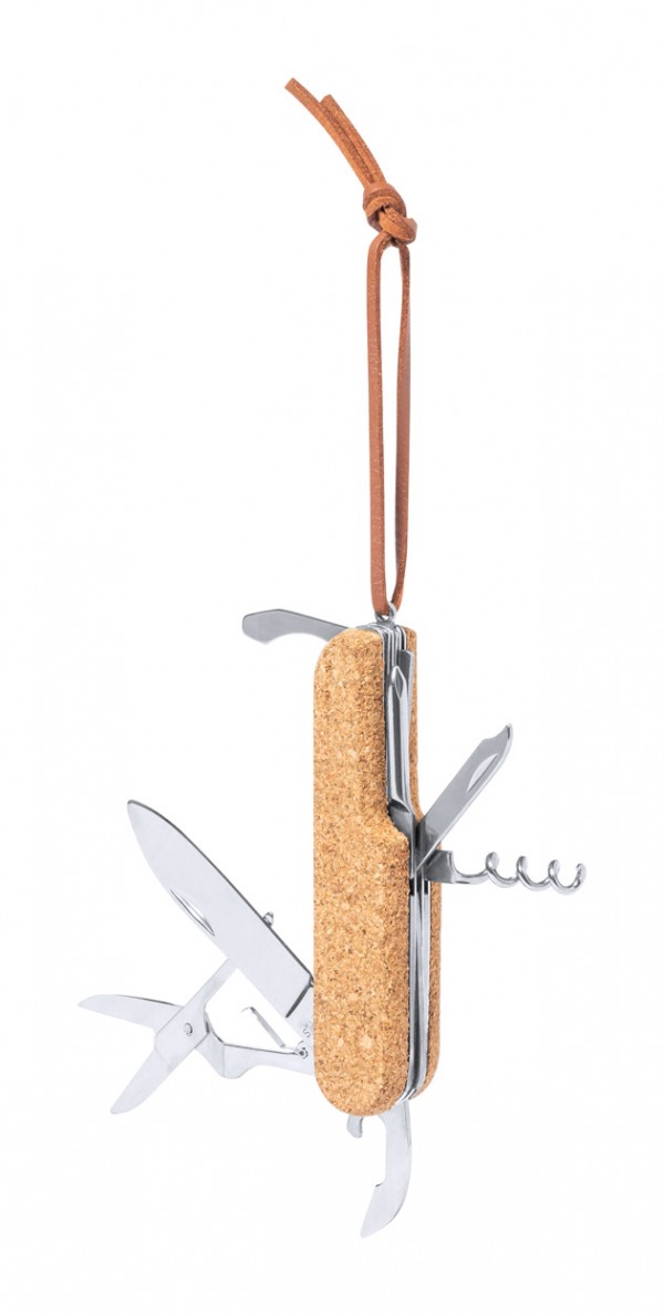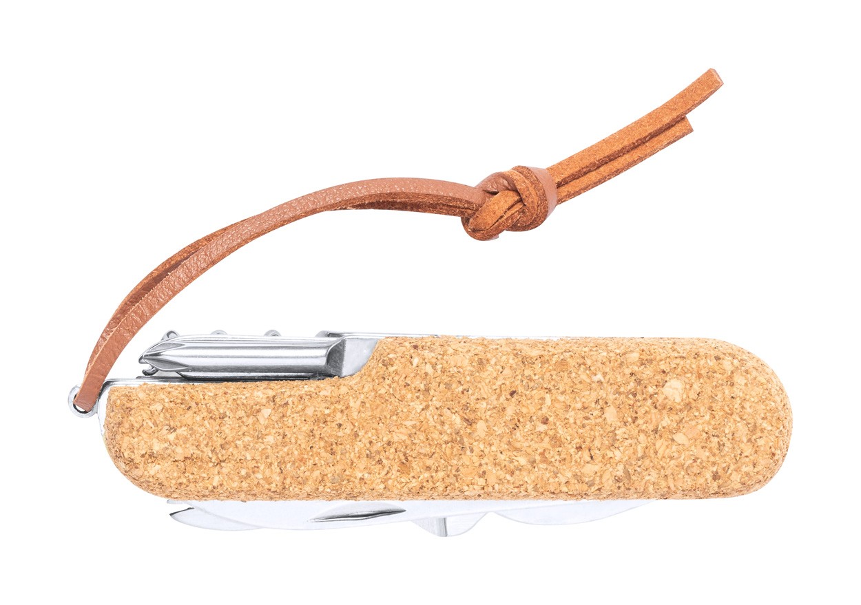 Cuțit de buzunar, din oțel inoxidabil, cu mâner din plută naturală și 9 funcții. Cu curea de transport din piele PU.
