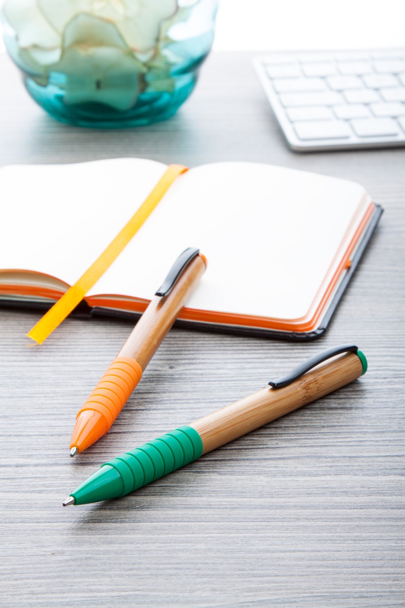 Pix din bambus cu deschidere prin răsucire, clips metalic, vârfuri colorate, dispozitiv de prindere colorat cauciucat, mină albastră.