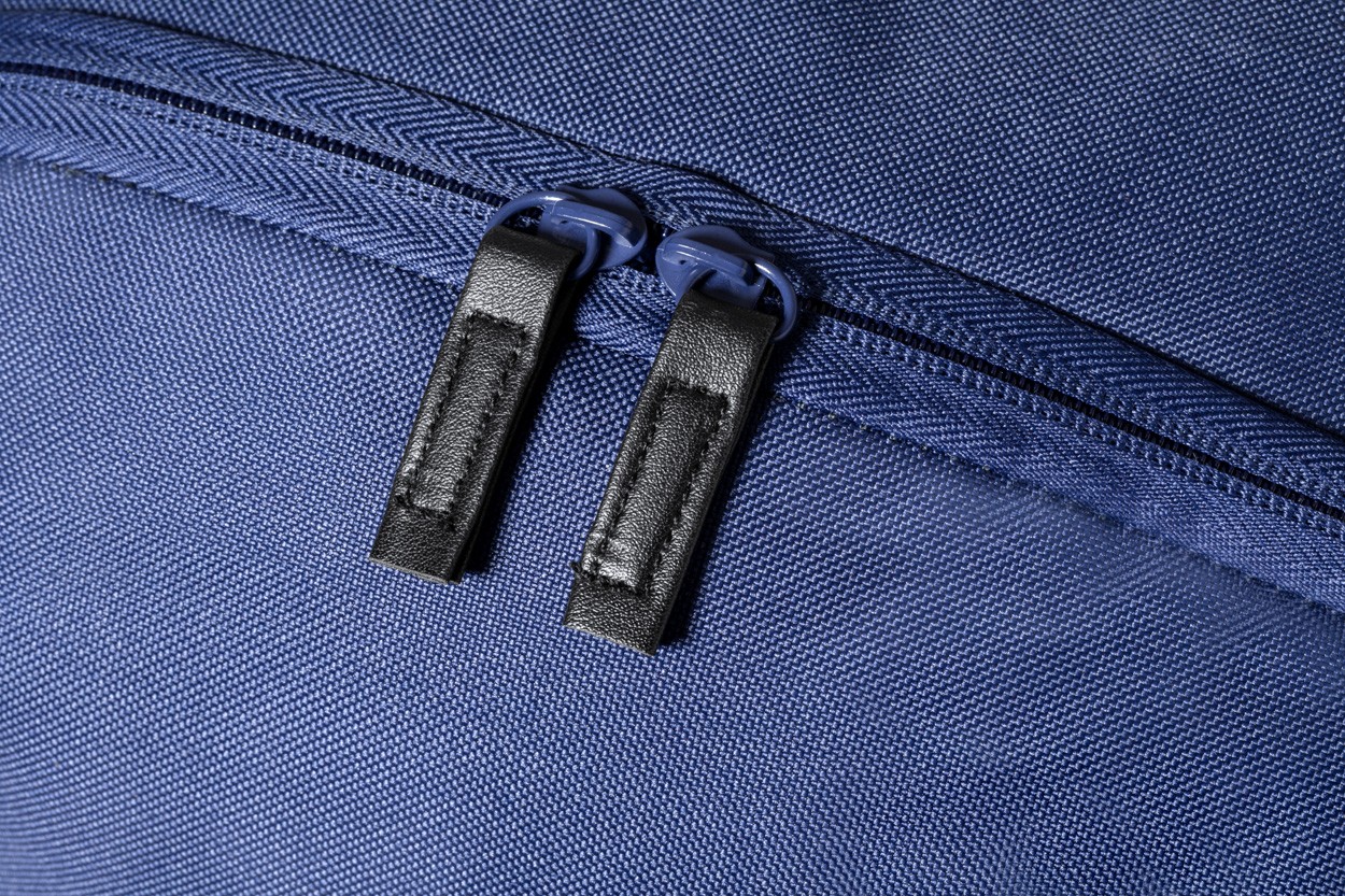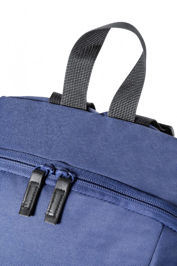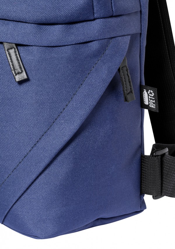 Rucsac RPET, cu compartimente cu fermoar, spate căptușit și bretele de umăr reglabile. Poliester 600D RPET cu etichetă distinctivă RPET.