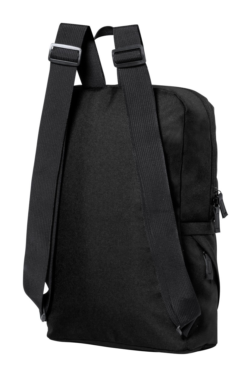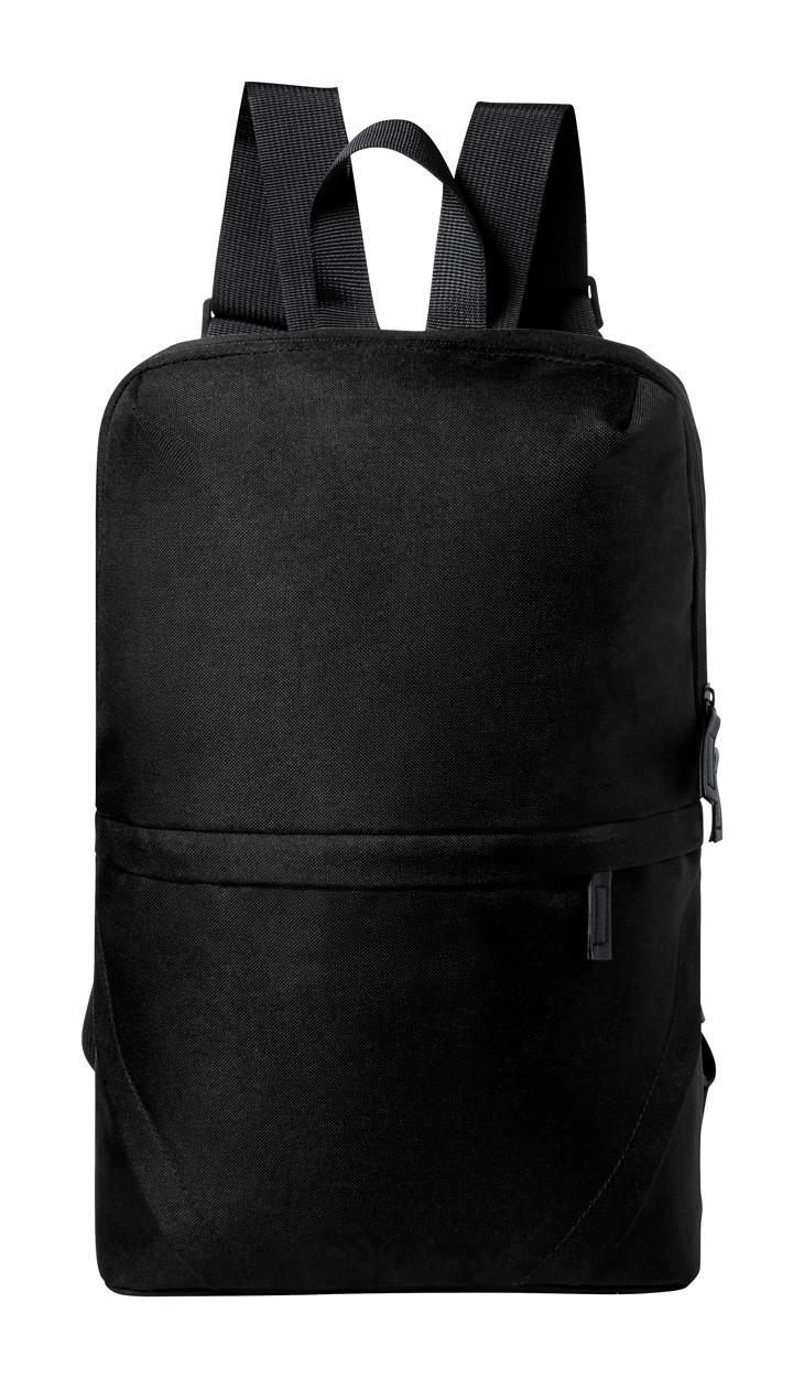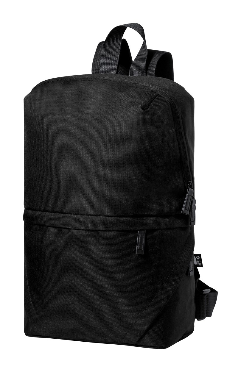 Rucsac RPET, cu compartimente cu fermoar, spate căptușit și bretele de umăr reglabile. Poliester 600D RPET cu etichetă distinctivă RPET.