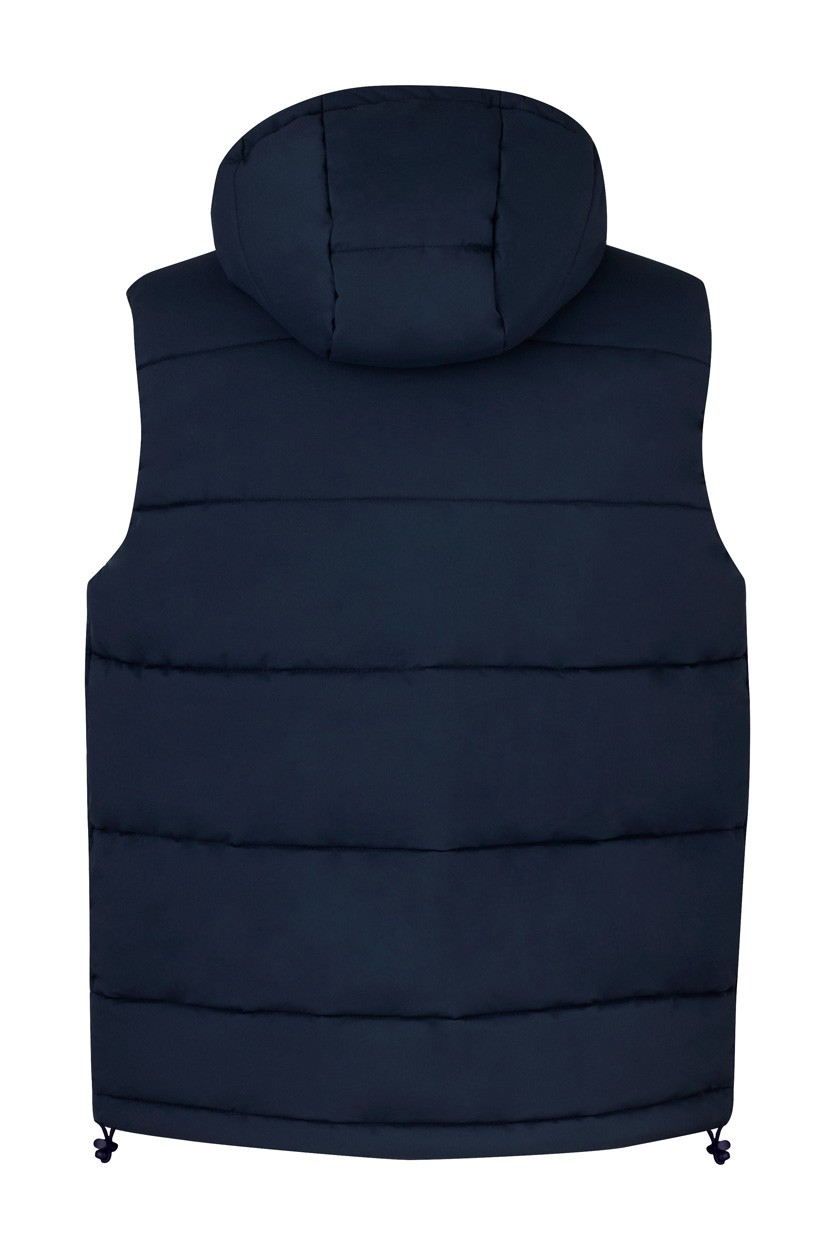 Vestă căptușită, rezistentă la vânt și apă, cu fermoar frontal dublu și inchidere cu nasture. Cu glugă și buzunare laterale. 100% Poliester.