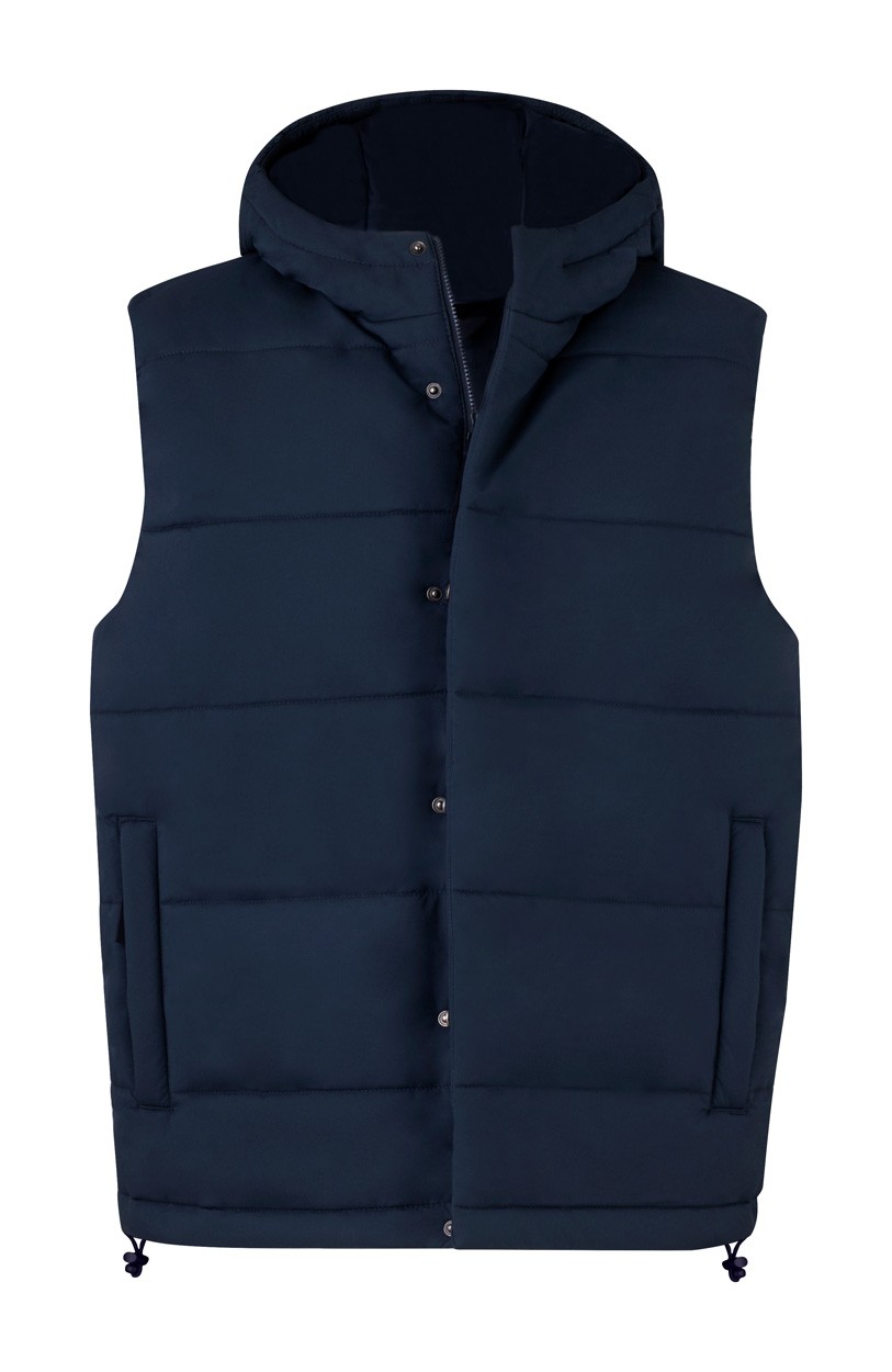 Vestă căptușită, rezistentă la vânt și apă, cu fermoar frontal dublu și inchidere cu nasture. Cu glugă și buzunare laterale. 100% Poliester.