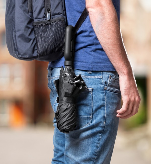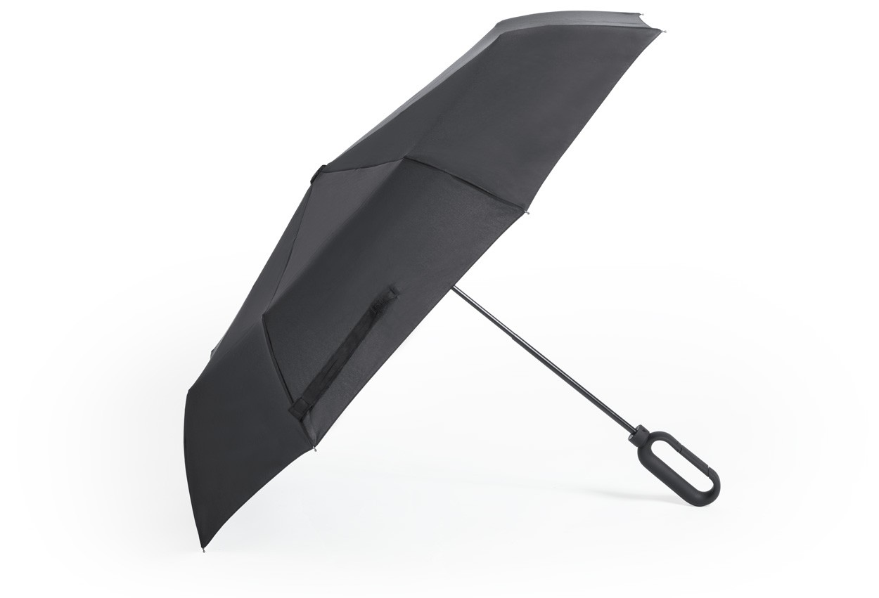 Umbrelă manuală pliabilă anti- vânt, cu 8 panele, spițe din fibră de sticlă, ax și cadru metalic. Cu mâner carabină. Pongee 190T.