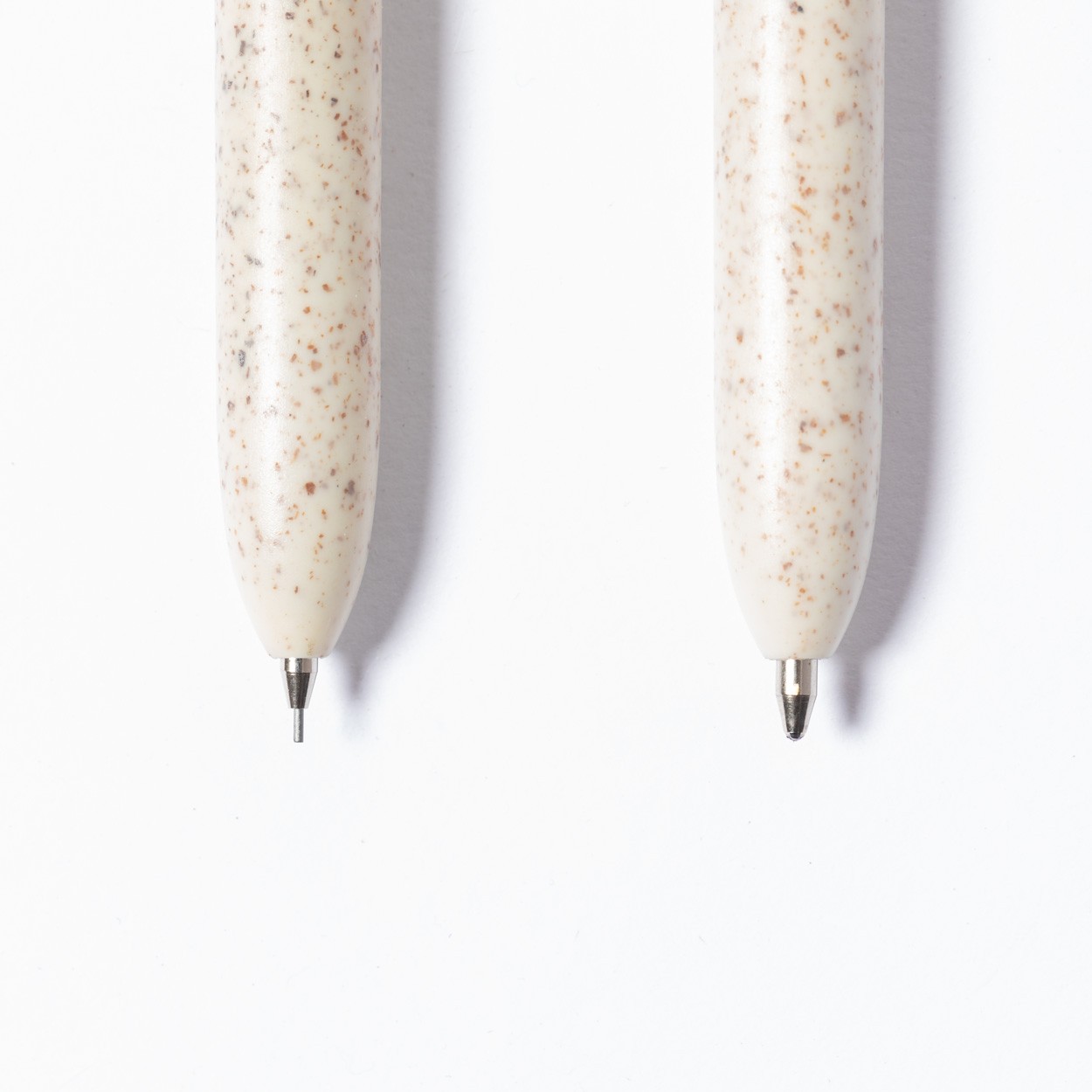Set pix din plastic din paie de grâu cu pix și creion mecanic cu clemă de bambus în cutie de hârtie reciclată. Cu reumplere albastră și mine de 0,5 mm.