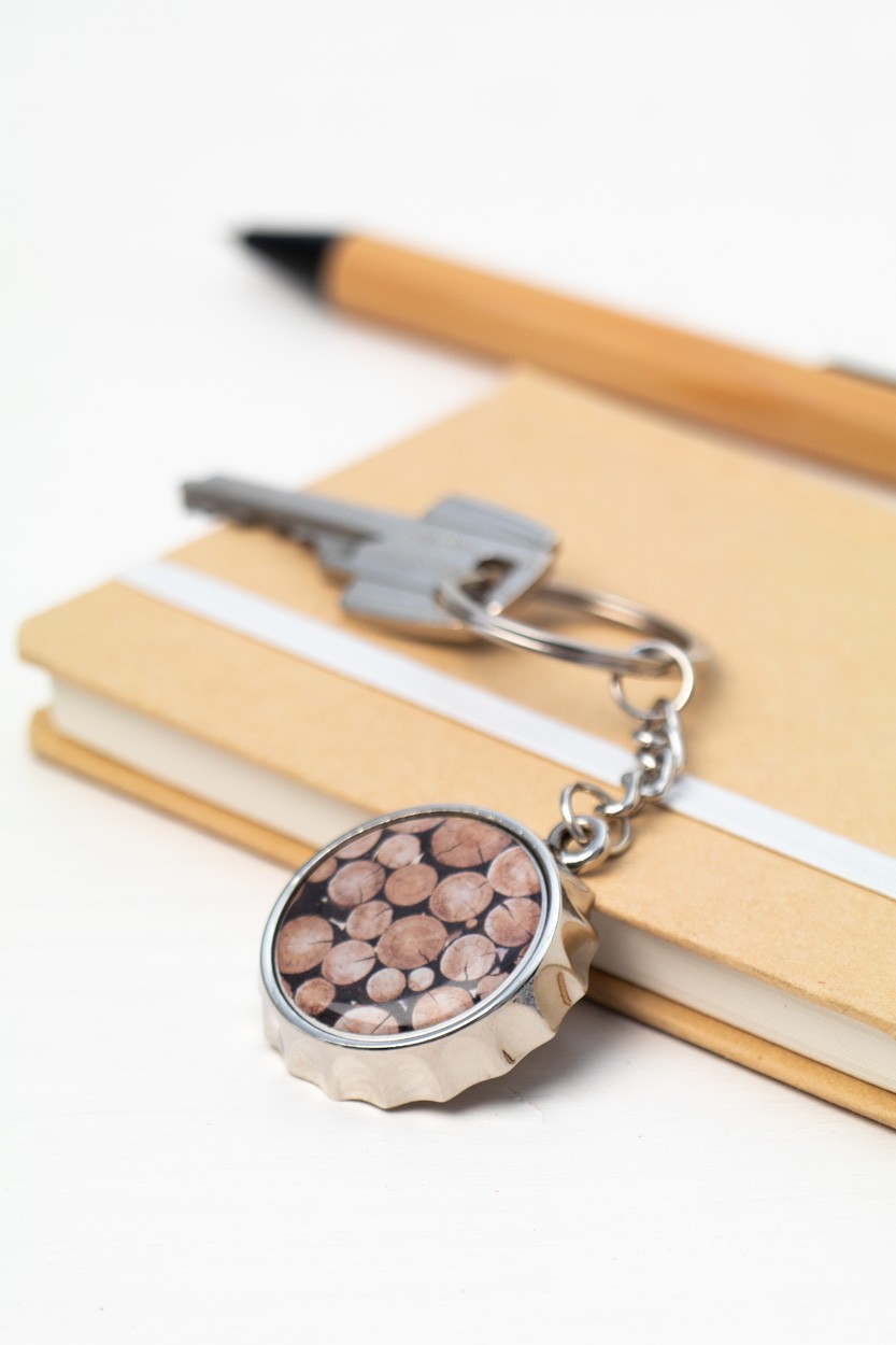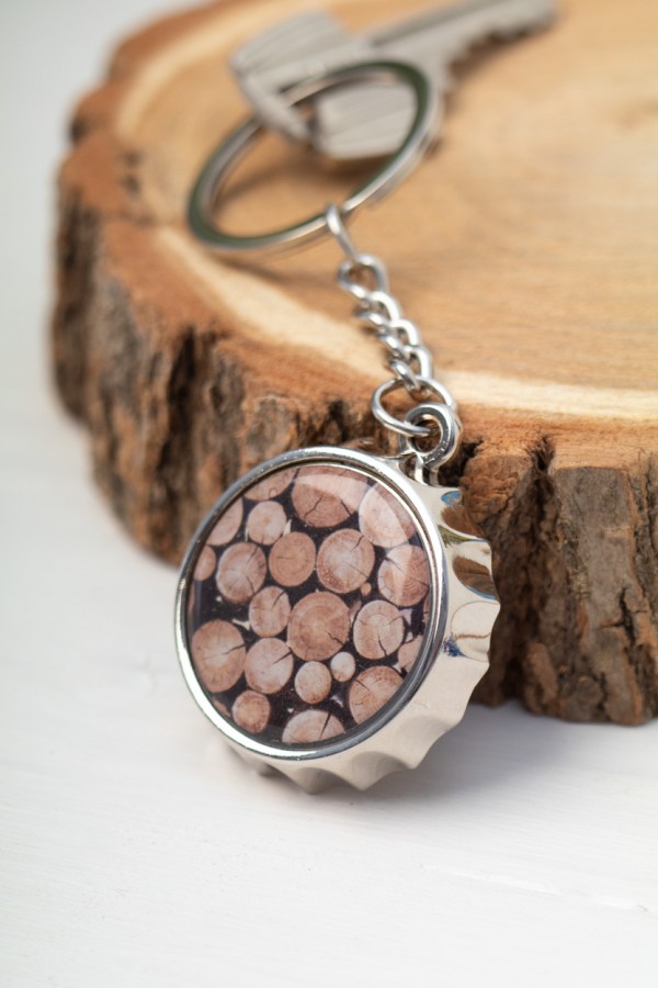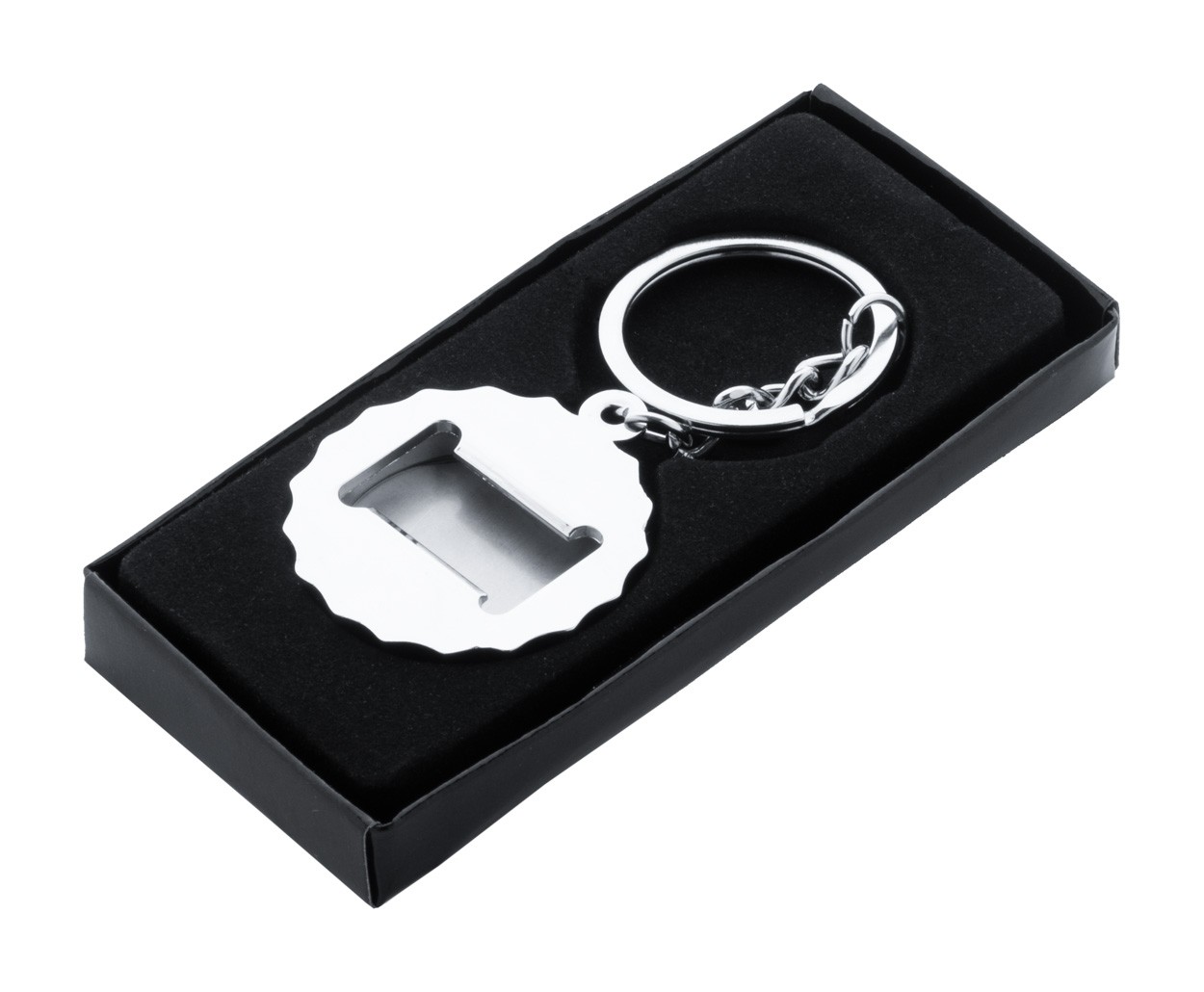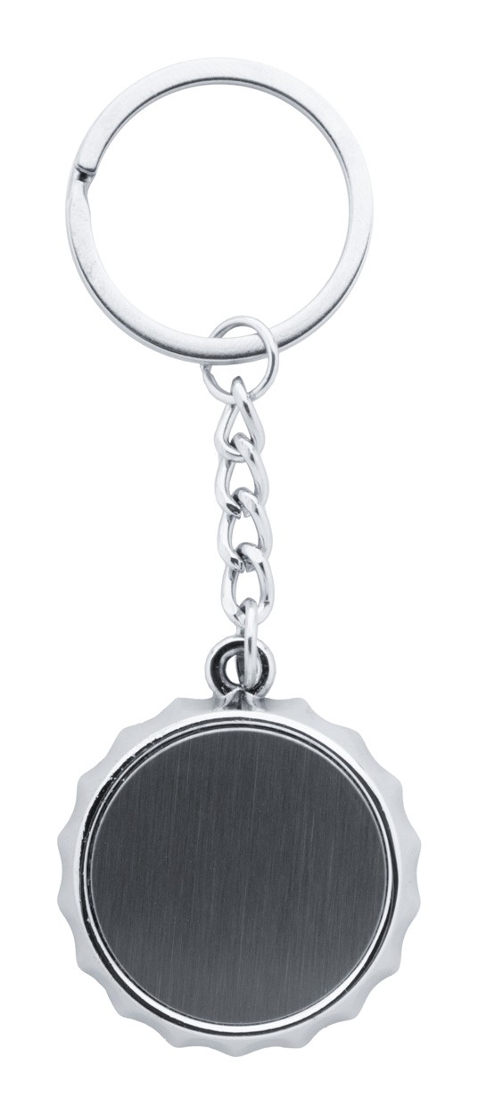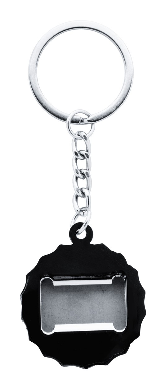 Breloc metalic, în formă de capac de sticlă, cu deschizător de sticle. În cutie cadou neagră. Ideal pentru imprimarea cu rășină epoxidică.