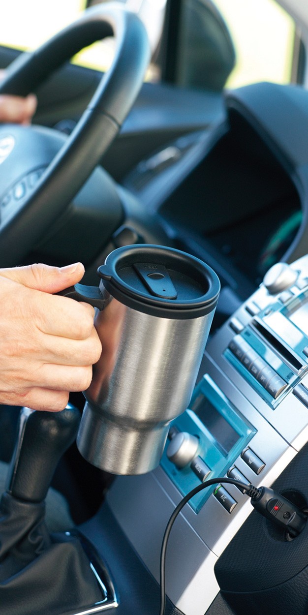 Cană termos pentru masină, 450 ml, cu mâner şi capac din plastic. Sistem de încălzire prin bricheta maşinii.