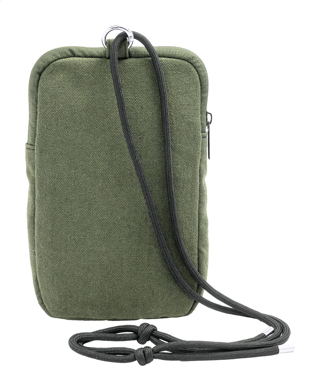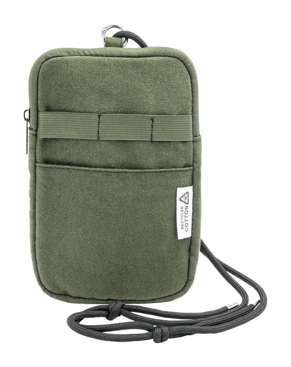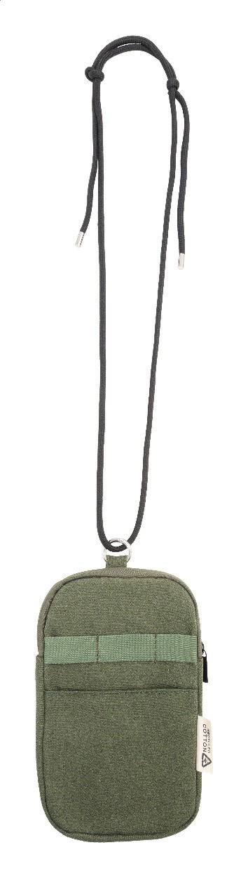 Geantă pentru telefon mobil, crossbody, din pânză reciclată, cu compartiment principal cu fermoar, buzunar frontal și șnur reglabil din poliester RPET. 70% bumbac reciclat și 30% poliester RPET. Cu etichetă distinctivă din bumbac reciclat.