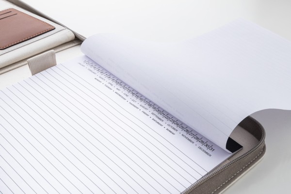Dosar pentru documente de dimensiune A4, din pânză și piele PU reciclată, cu fermoar, cu mâner de transport și mai multe buzunare interioare pentru organizare. Cu blocnotes cu 20 de foi dictando din hârtie reciclată. 70% bumbac reciclat și 30% poliester RPET.