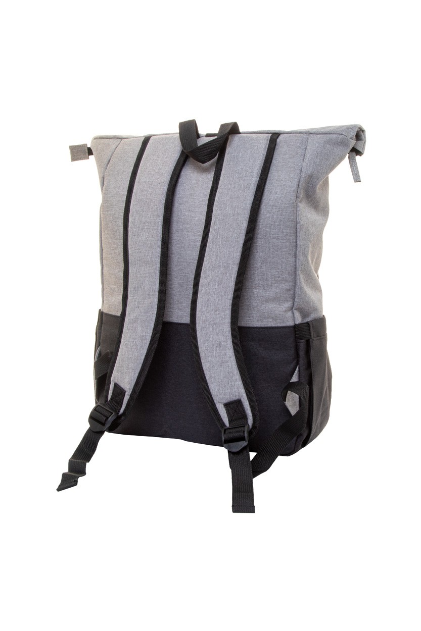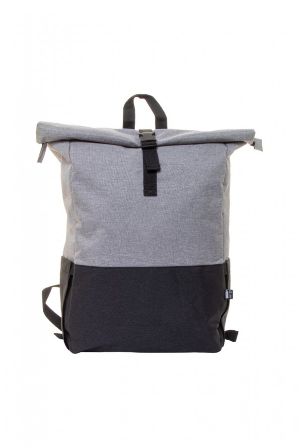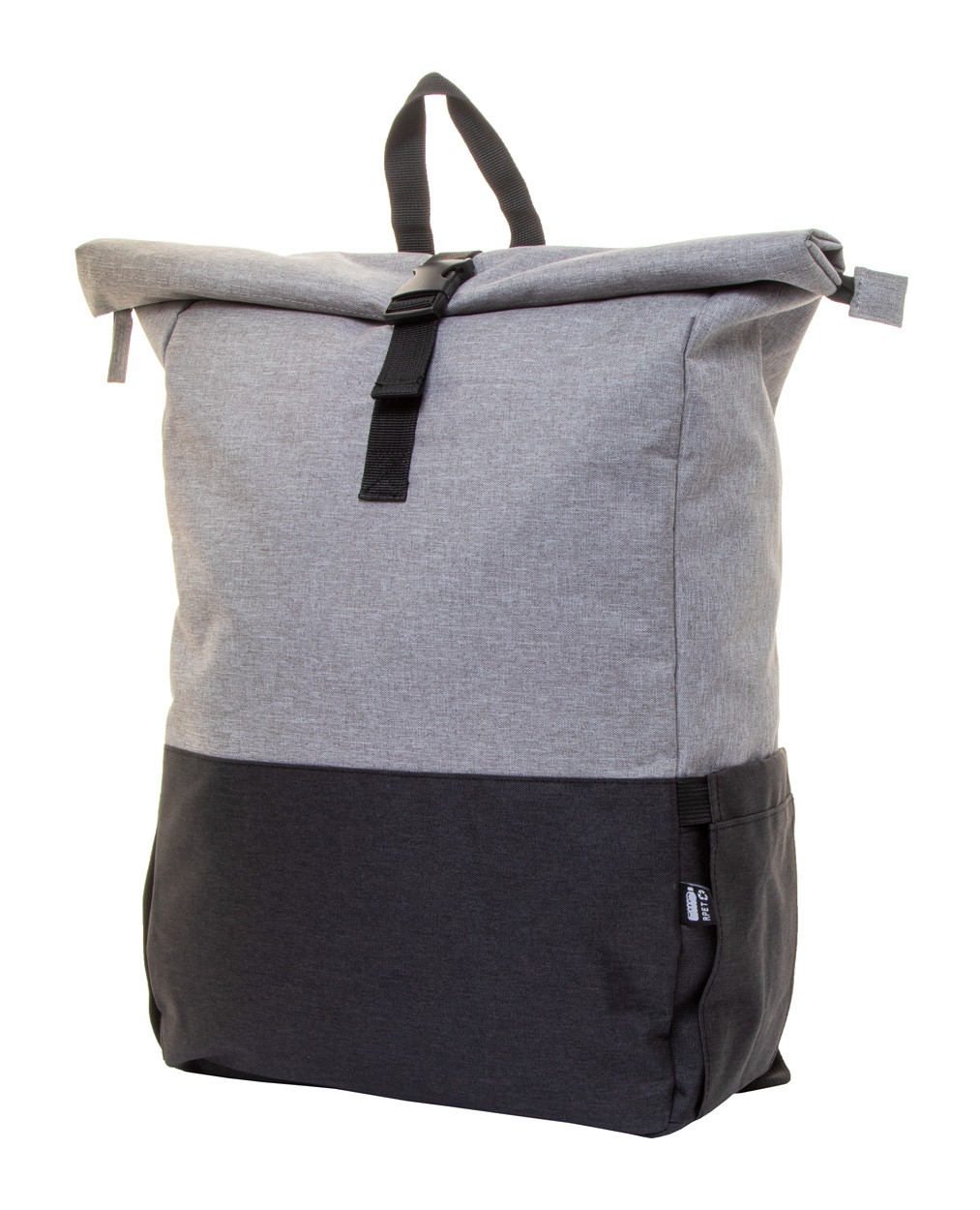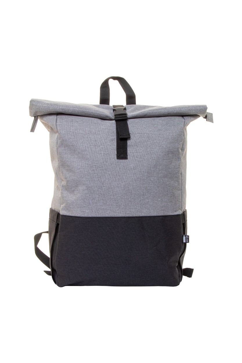 Rucsac bicolor, RPET rolltop, cu închidere cu cataramă, compartiment principal cu fermoar, compartiment căptușit pentru laptop (15") și tabletă (10"), buzunare laterale, spate căptușit și bretele de umăr. Poliester 300D RPET cu etichetă distinctivă RPET.