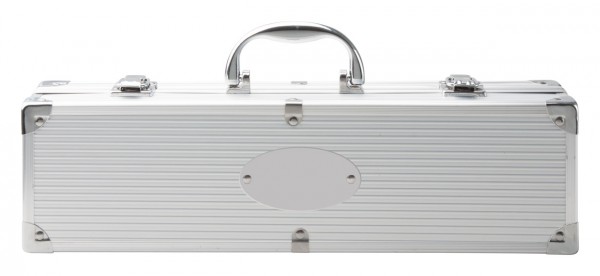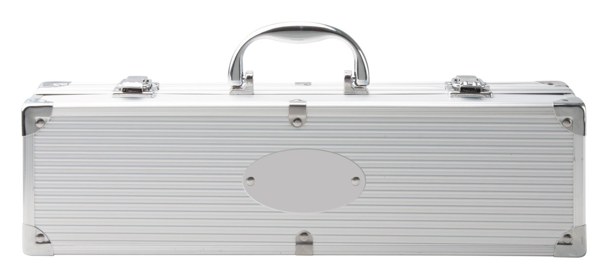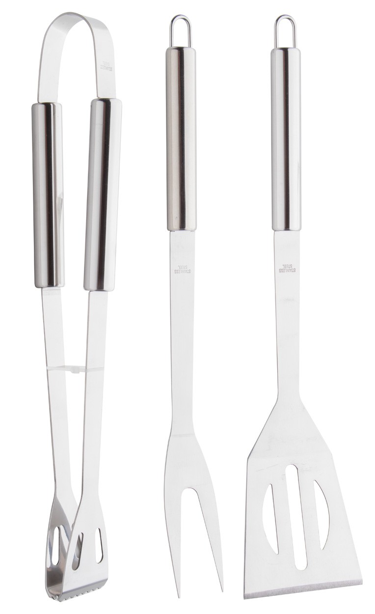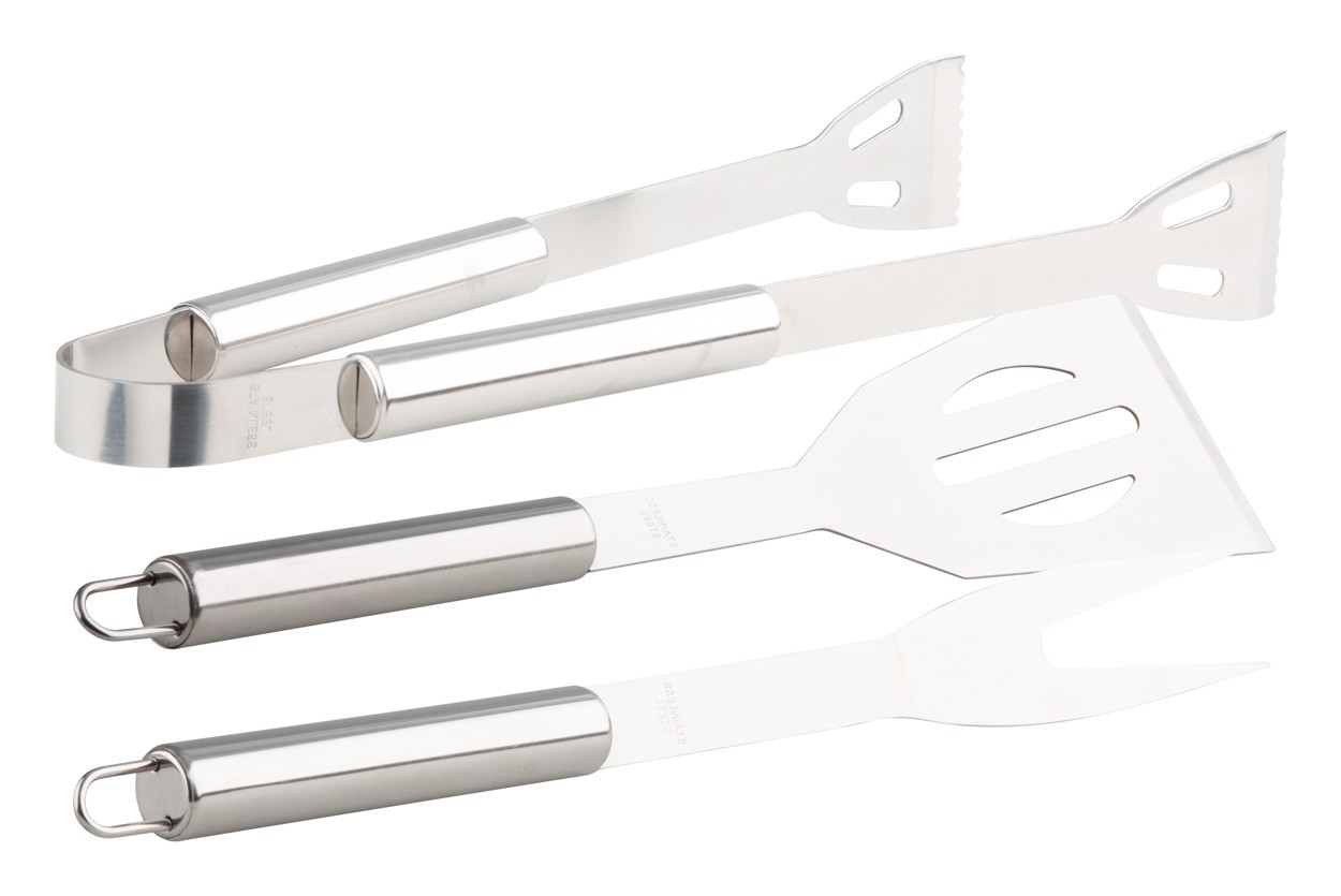 Set grătar cu 3 piese, din oțel inoxidabil (furculiță, paletă și clește) în cutie din aluminiu.