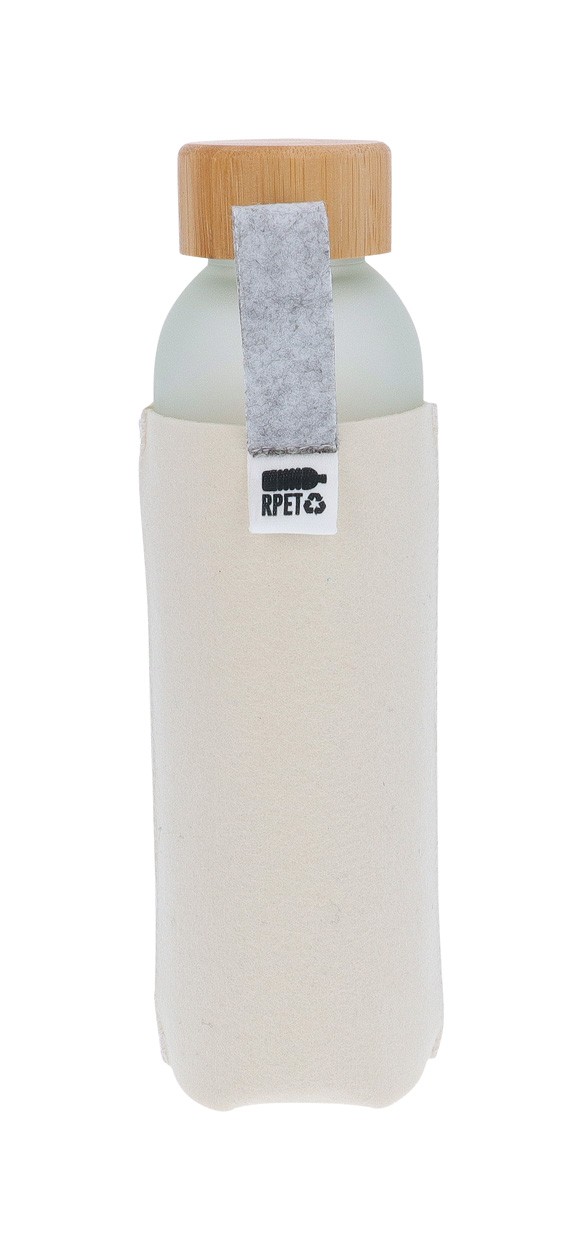 Sticlă de sticlă, cu capac din bambus, husă din pâslă RPET realizată la comandă, cu grafică imprimată color și etichetă RPET distinctă. Prețul include imprimarea prin sublimare. 500 ml. MOQ: 50 buc. Nu este potrivit pentru băuturi carbogazoase.