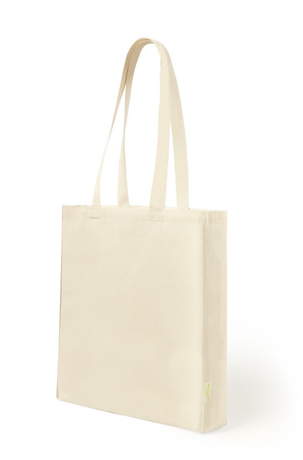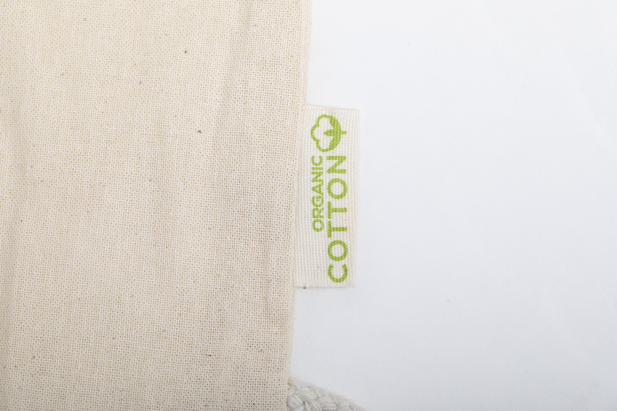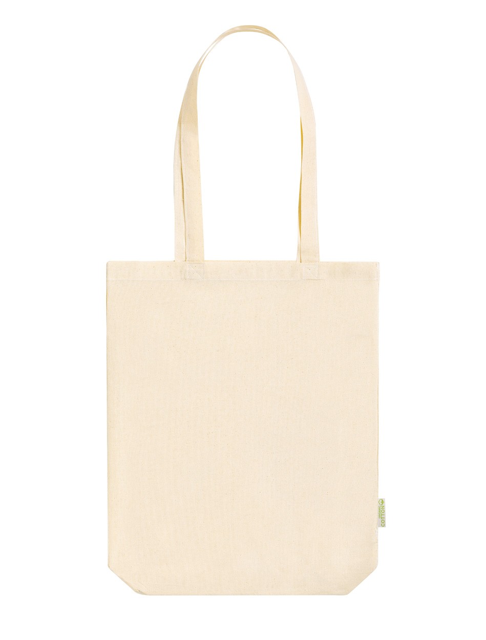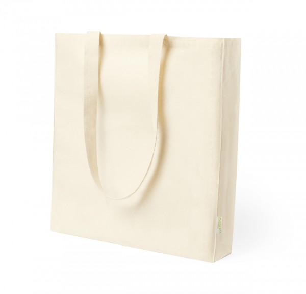 Sacoșă de cumpărături din bumbac organic cu mânere lungi și etichete de bumbac organic distinctiv. 100% bumbac organic, 140 g/m².
