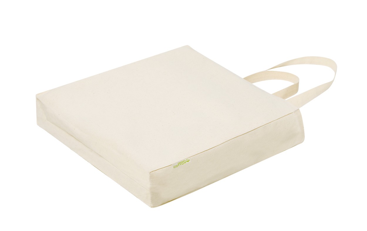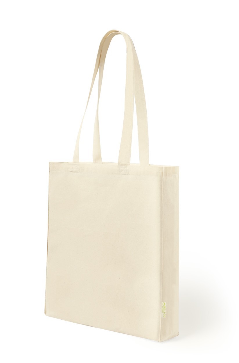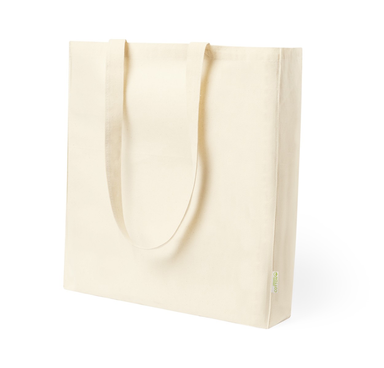 Sacoșă de cumpărături din bumbac organic cu mânere lungi și etichete de bumbac organic distinctiv. 100% bumbac organic, 140 g/m².