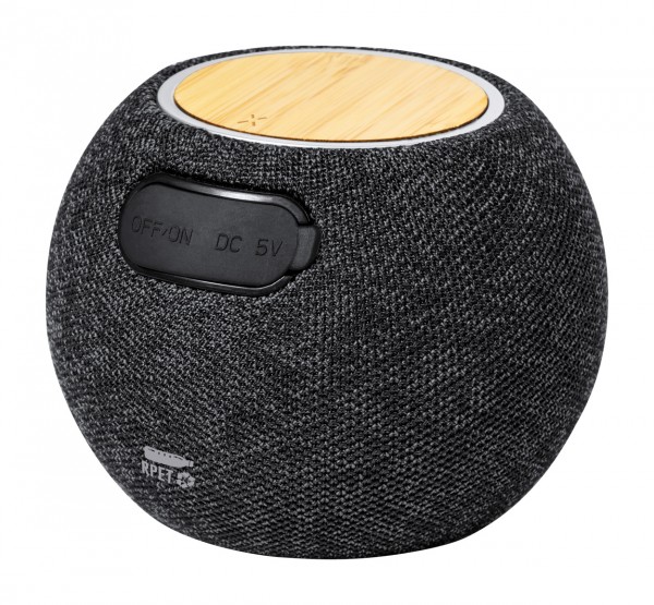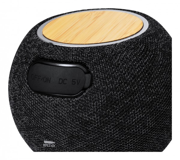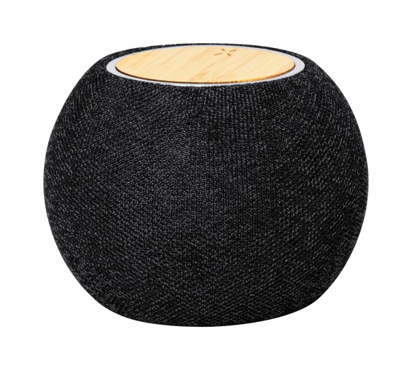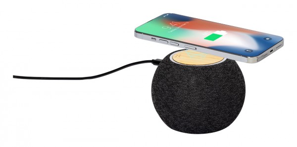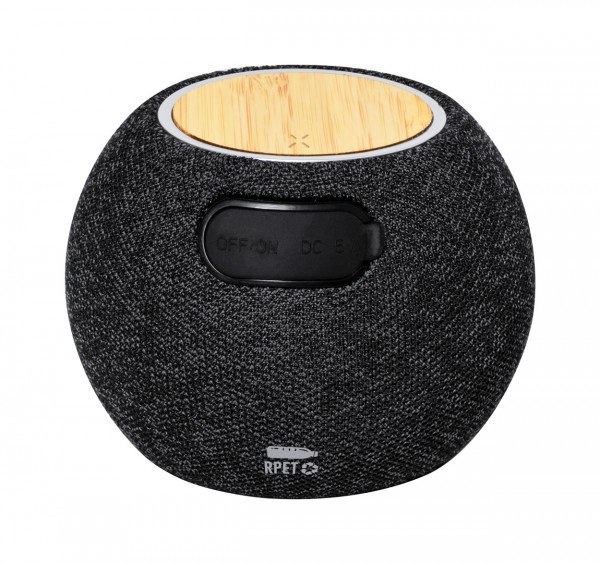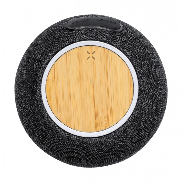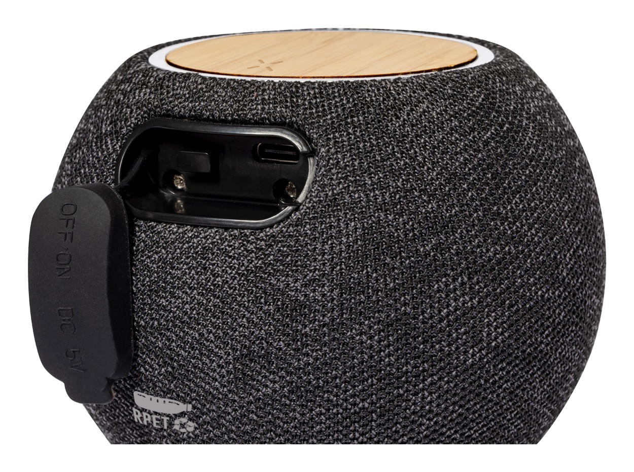 Difuzor Bluetooth, acoperit cu material 300D RPET și încărcător rapid fără fir cu placă de bambus (15W) în partea de sus. Cu baterie reîncărcabilă încorporată (1200 mAh). Inclusiv cablu de încărcare USB.