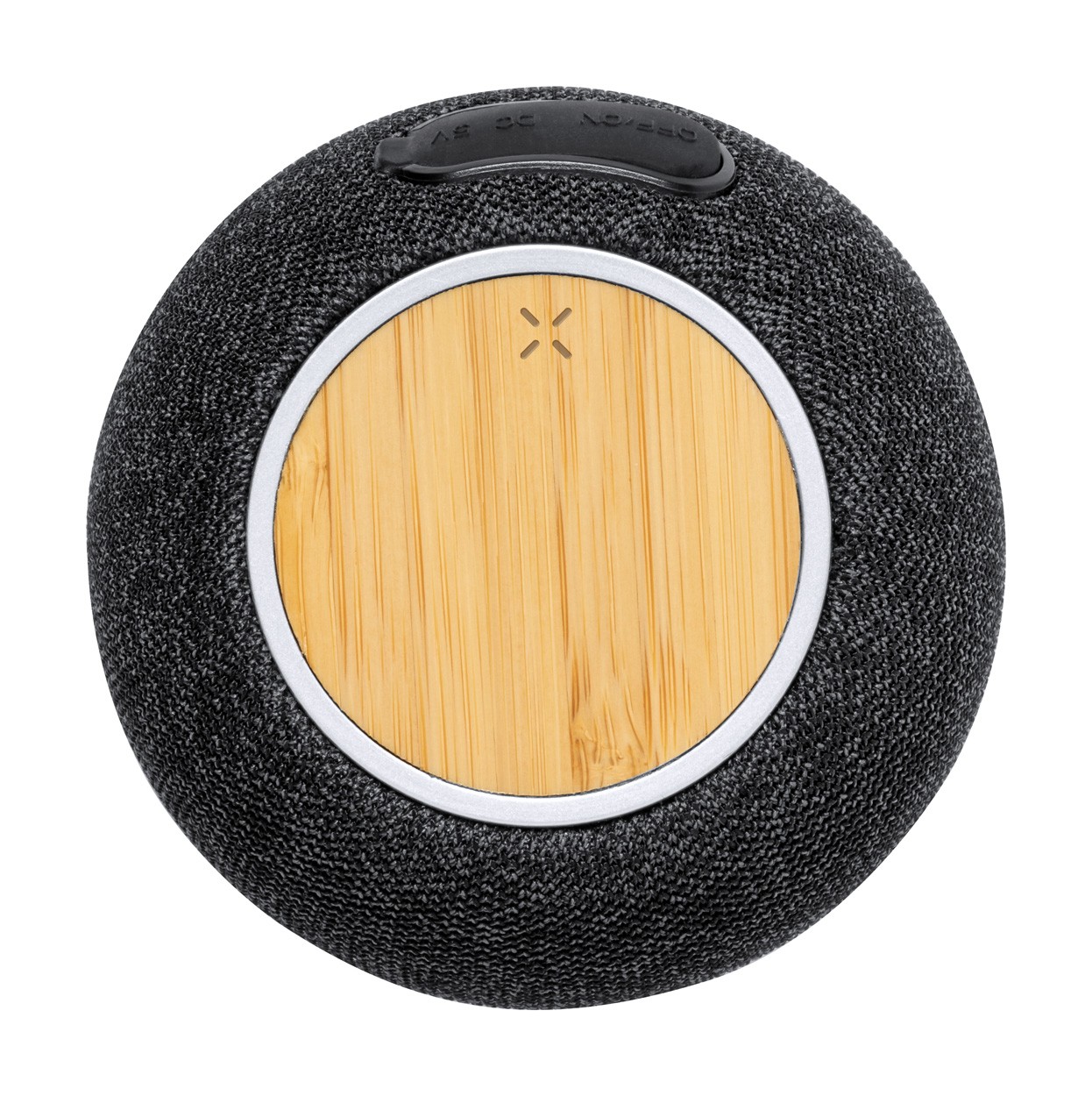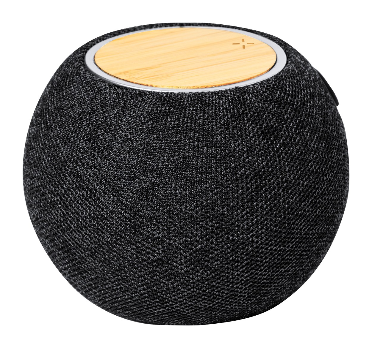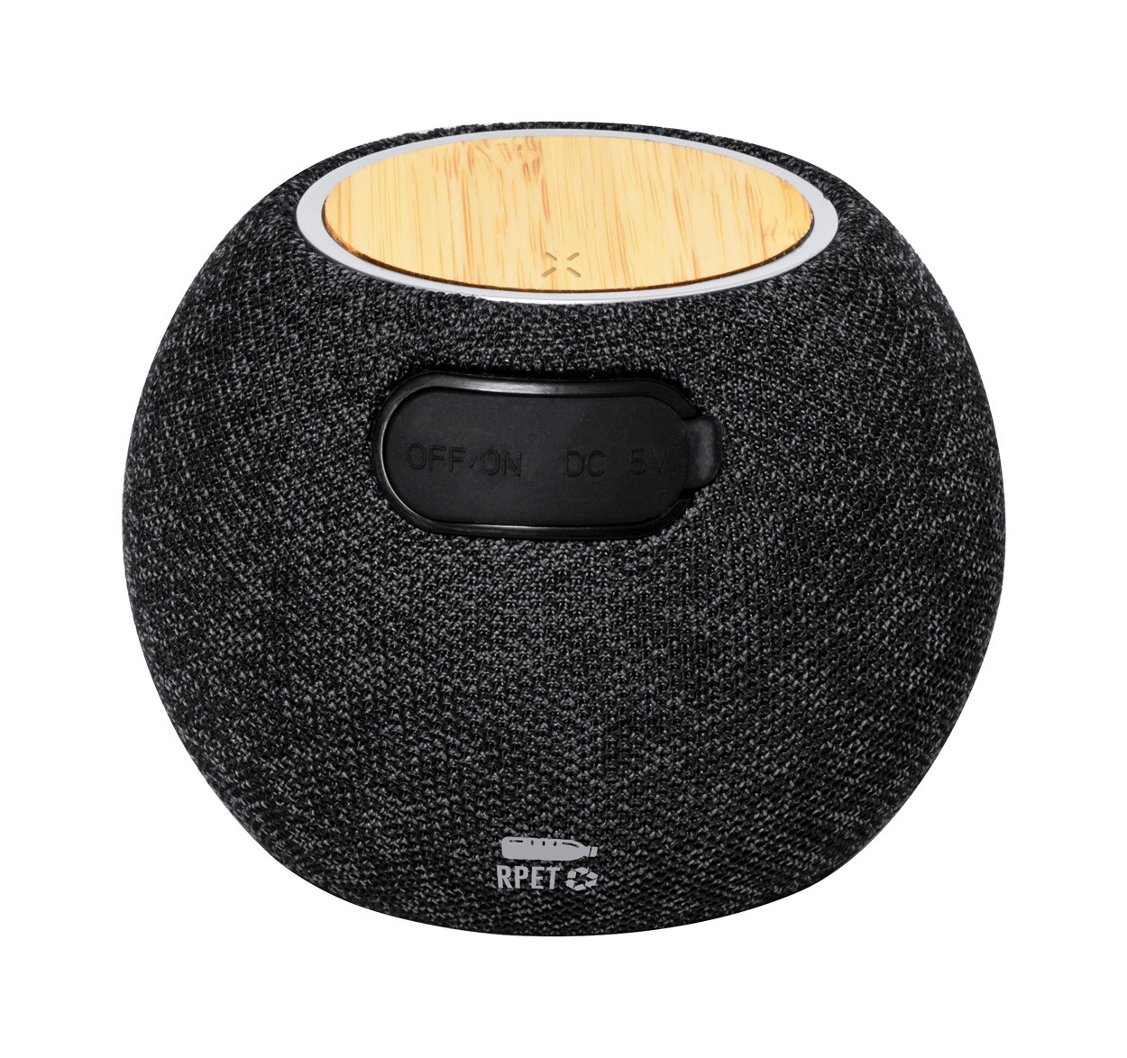 Difuzor Bluetooth, acoperit cu material 300D RPET și încărcător rapid fără fir cu placă de bambus (15W) în partea de sus. Cu baterie reîncărcabilă încorporată (1200 mAh). Inclusiv cablu de încărcare USB.
