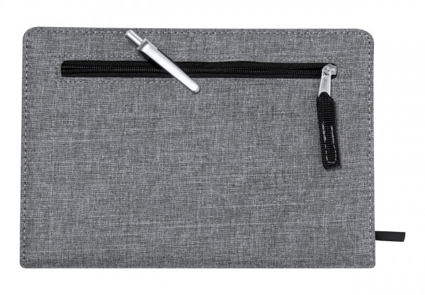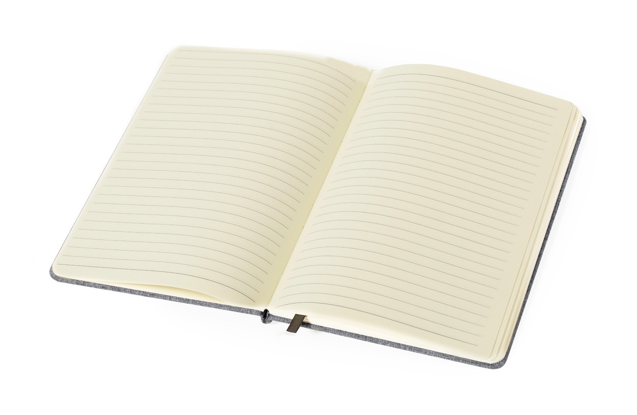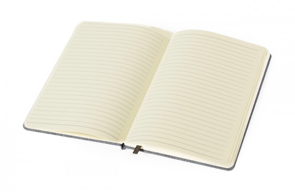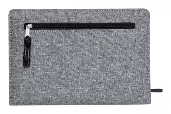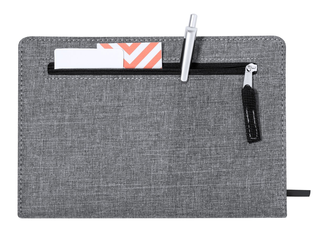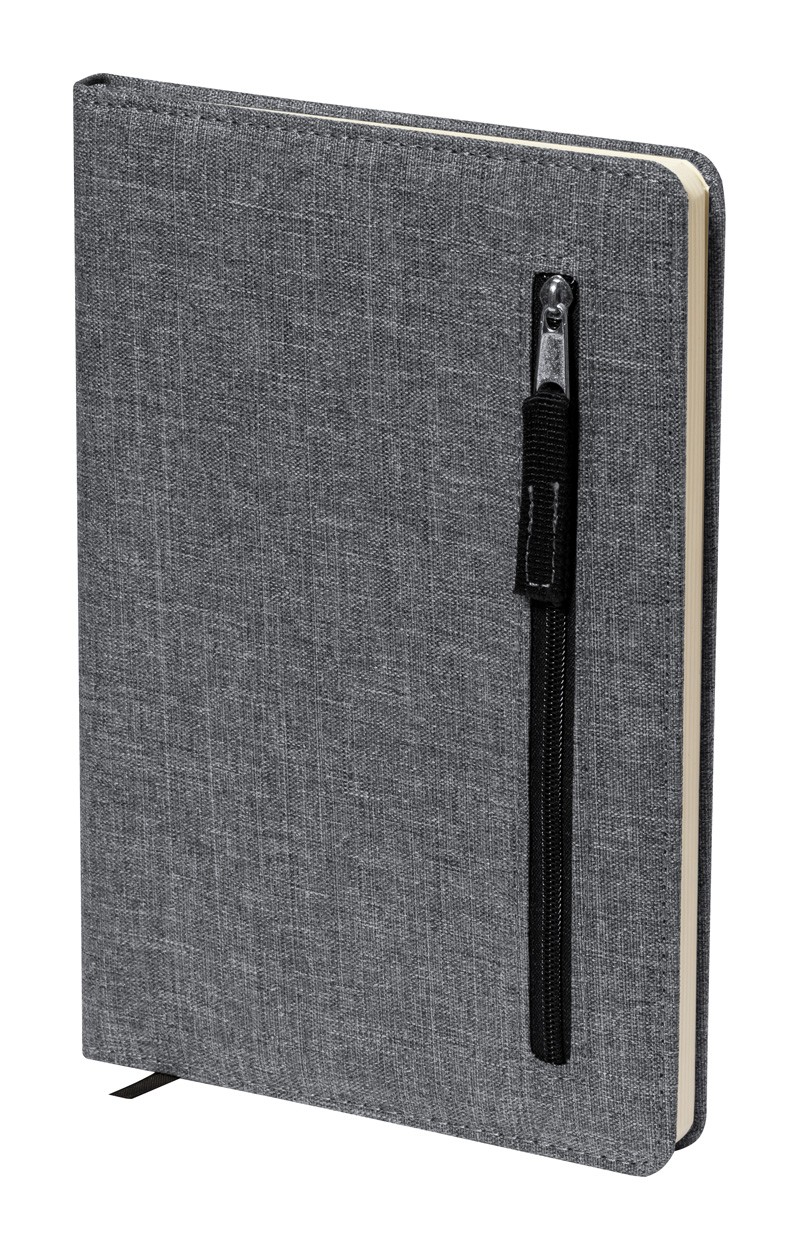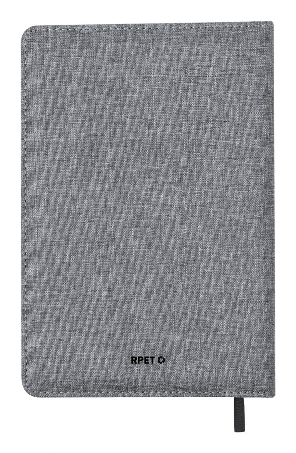 300D RPET polyester covered notebook with zipped front pocket, bookmark and 100 lined sheets. A5 size.