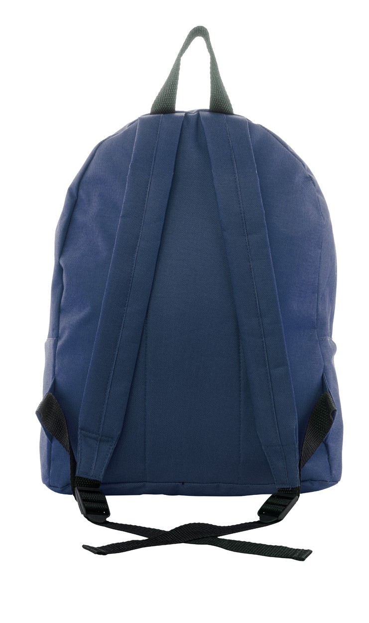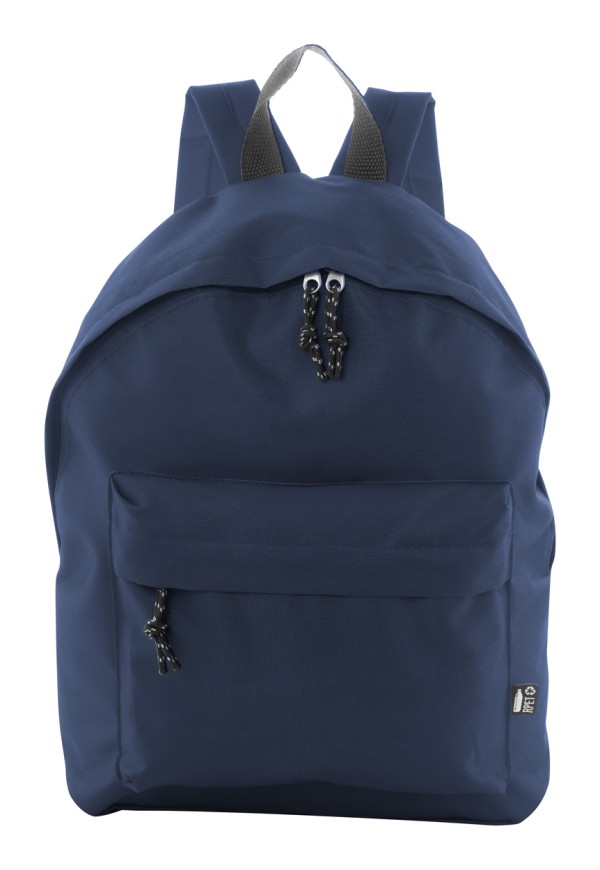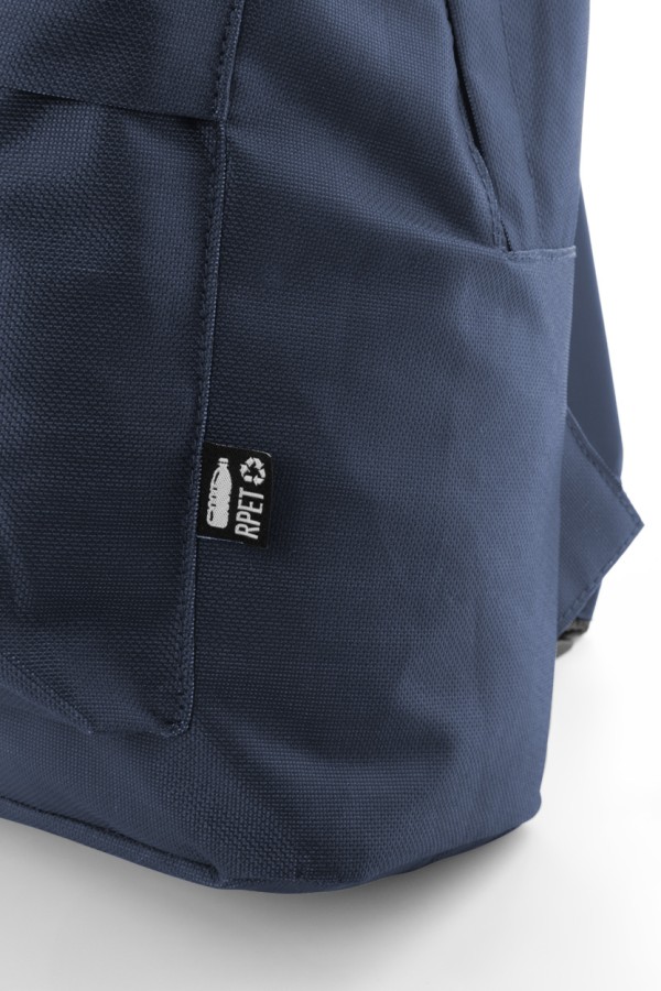 Rucsac RPET cu compartiment principal cu fermoar, buzunar frontal cu fermoar, spate și bretele de umăr căptușite. Poliester 600D RPET, cu etichetă distinctivă RPET.