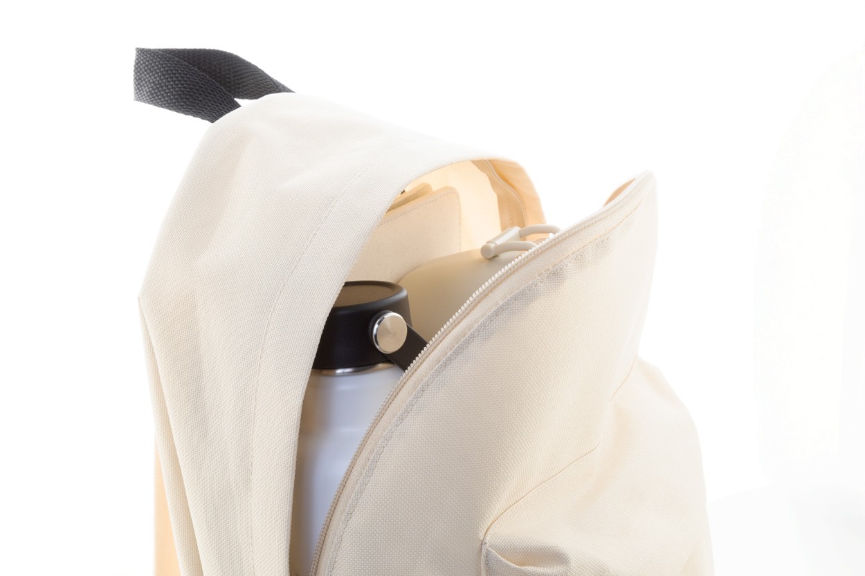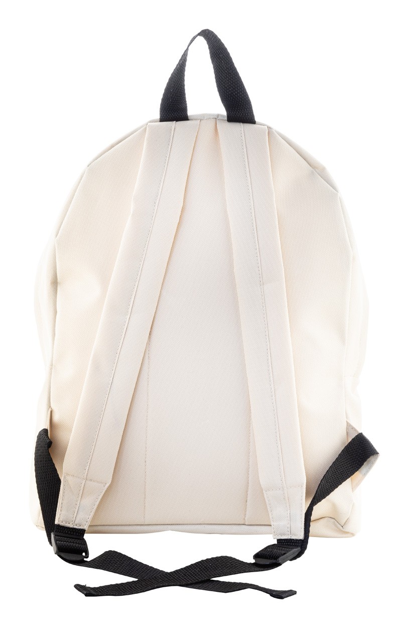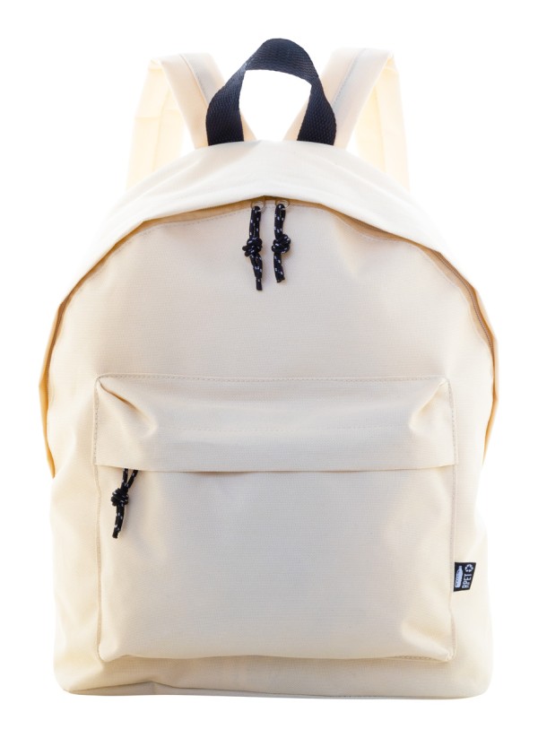 Rucsac RPET cu compartiment principal cu fermoar, buzunar frontal cu fermoar, spate și bretele de umăr căptușite. Poliester 600D RPET, cu etichetă distinctivă RPET.