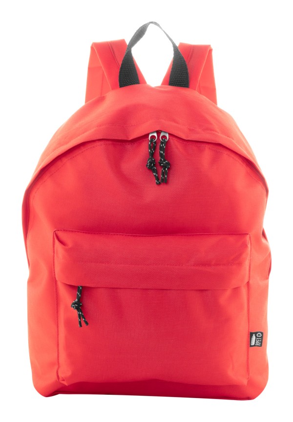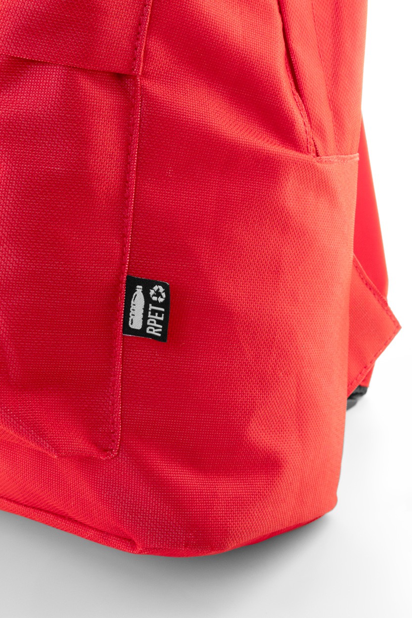 Rucsac RPET cu compartiment principal cu fermoar, buzunar frontal cu fermoar, spate și bretele de umăr căptușite. Poliester 600D RPET, cu etichetă distinctivă RPET.