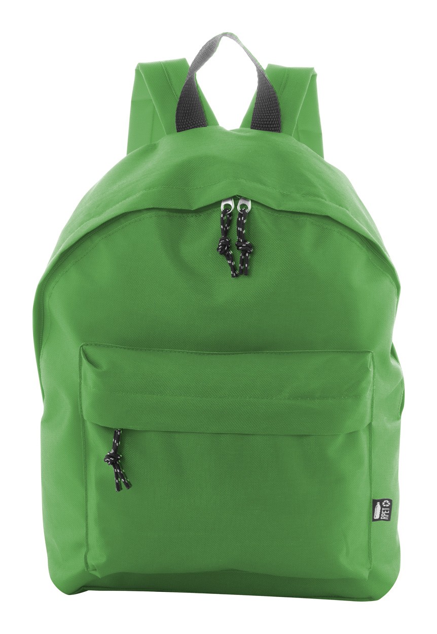 Rucsac RPET cu compartiment principal cu fermoar, buzunar frontal cu fermoar, spate și bretele de umăr căptușite. Poliester 600D RPET, cu etichetă distinctivă RPET.