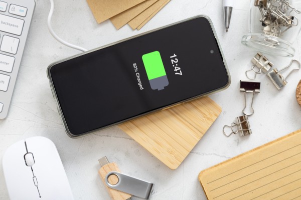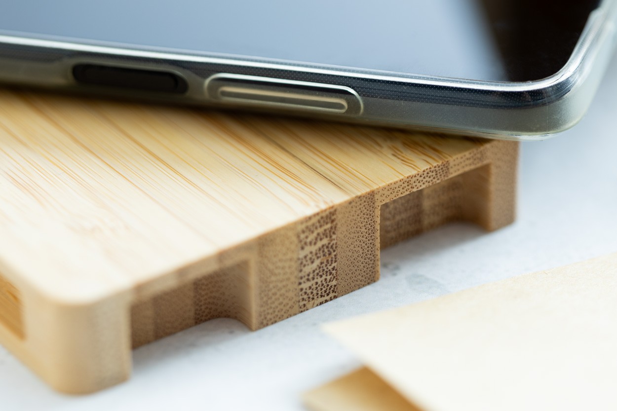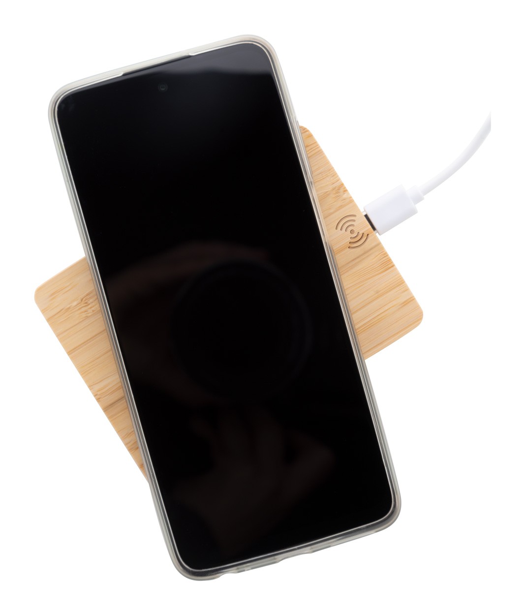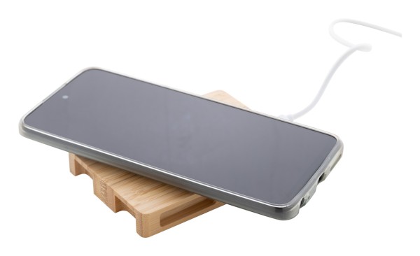 Încărcător rapid fără fir (10W), în carcasă din bambus în formă de palet. Inclusiv cablu de încărcare USB.