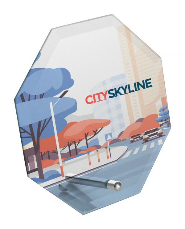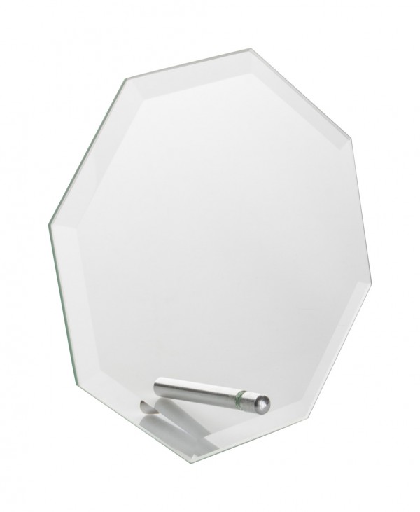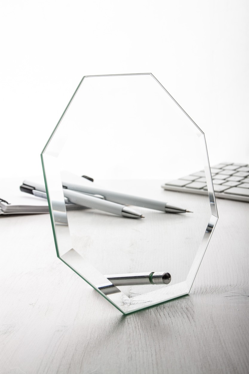 Trofeu octogonal din sticlă cu suport metalic. În cutie neagră de cadou.