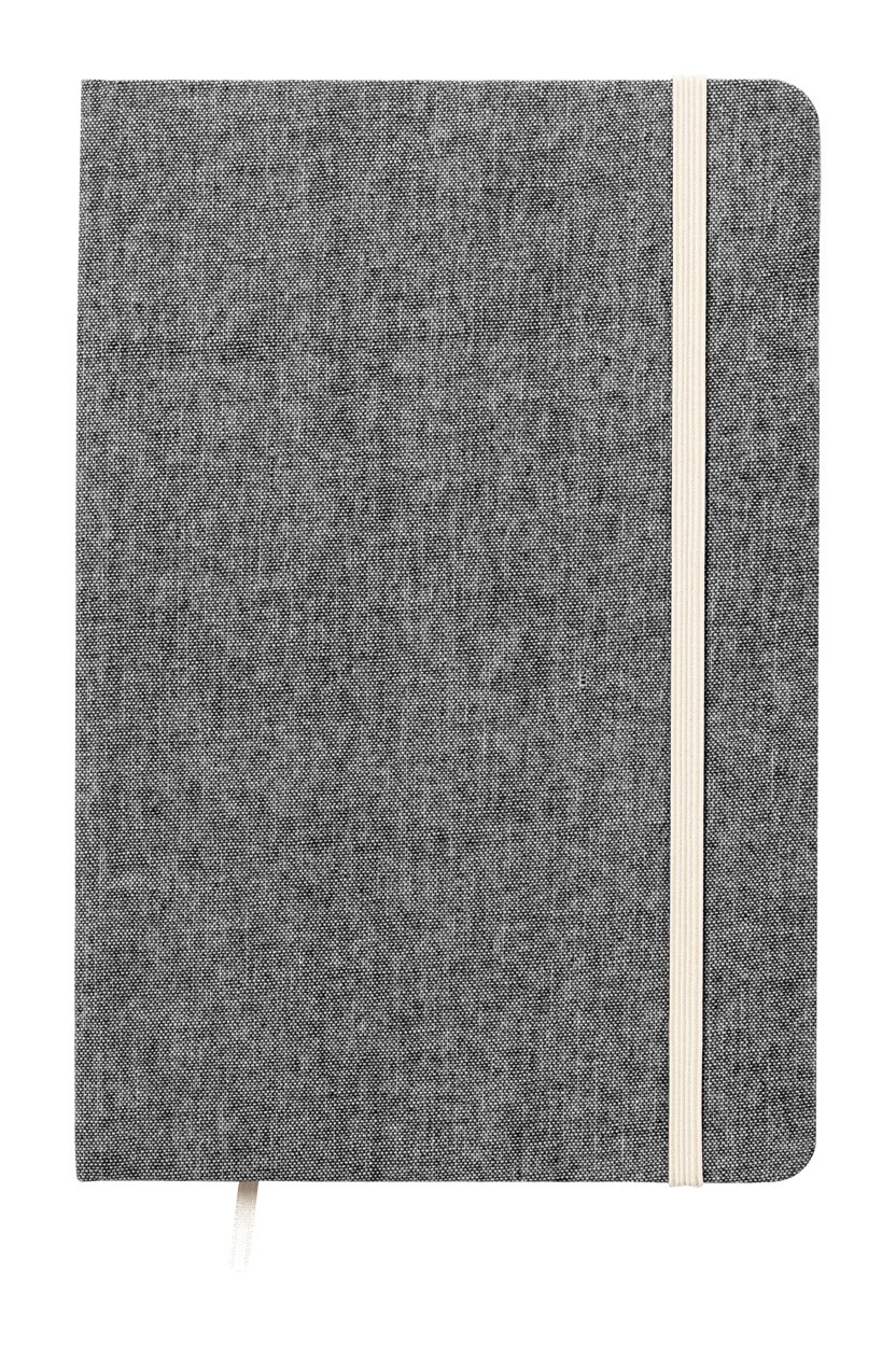 Caiet cu coperta din bumbac reciclat, cu 100 de foi veline, semn de carte și curea de cauciuc. 100% bumbac reciclat. Dimensiune A5.