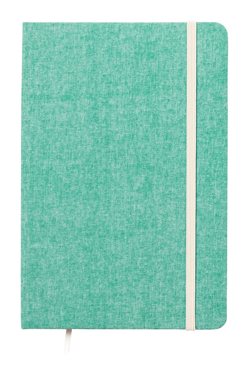 Caiet cu coperta din bumbac reciclat, cu 100 de foi veline, semn de carte și curea de cauciuc. 100% bumbac reciclat. Dimensiune A5.